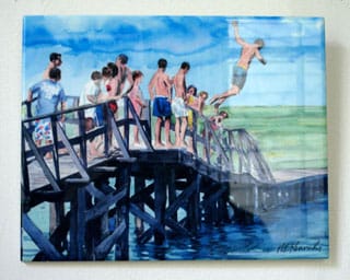 There are hundreds of pictures at Kennedy Studios, filling up the wall space and stacked on the floor. They are not, in fact, paintings but reproductions of watercolors by Robert Edward Kennedy and his ex-wife, Michele Kennedy, that have been either framed or adhered to various supports. The prices go as low as $15. The one that caught my eye was a smallish picture of boys on a footbridge, lining up to dive into the water below. We used to come to Provincetown when I was a child, and I remember watching with envy the Portuguese children diving for the tourists’ quarters tossed from the main pier.