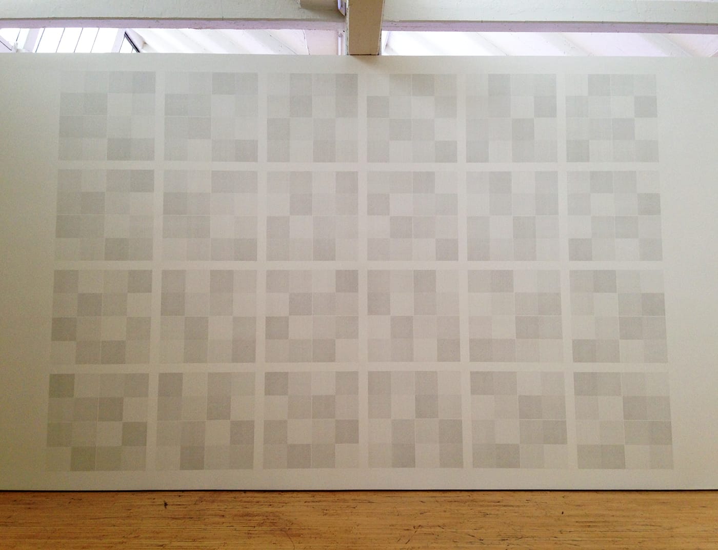 His grid drawings, despite the relentless logic of their recombined patterns, are a source of sheer elation, a radiant, ever-changing pattern of horizontal, vertical, and diagonal lines. That the actualized work is unguided by the artist’s eye, leaving the look of the piece to the incidentals of a preconceived system, makes its accidental beauty comparable to that of nature, but as nature’s inverse in its fundamental abstraction.