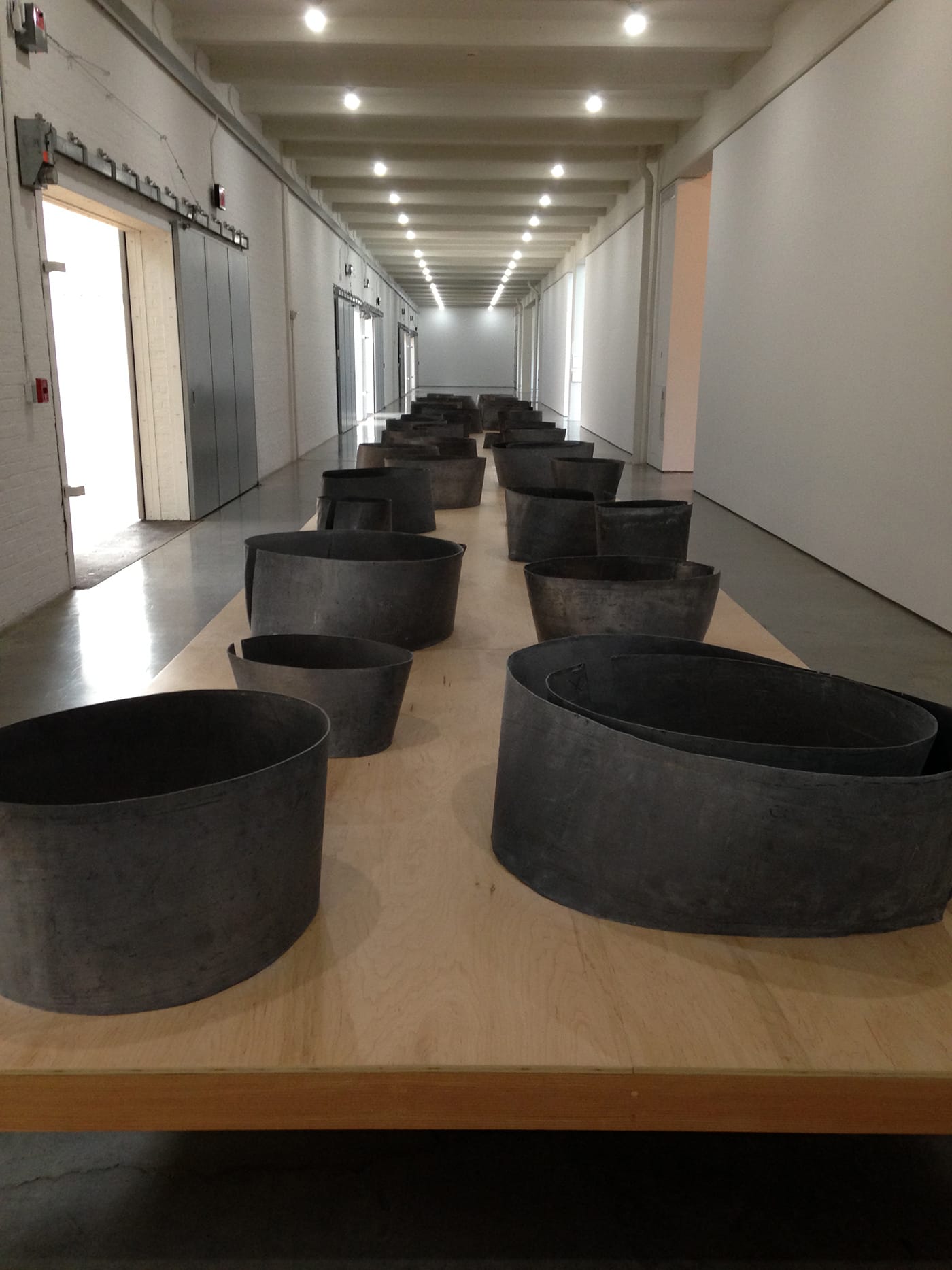 I never thought I would describe anything Serra touched as poignant, but there is something disarmingly affecting about these rounded, battleship gray sheets of lead, each curled by hand with a customized oval rolling device into an off-kilter, almost biomorphic pre-echo of the artist’s immense and impermeable steel ellipses. These are not scale models of planned sculptures, but experimental tryouts of an idea (for a commission from Dia) that Serra’s engineers doubted could work. In the current installation they are lined up in pairs across the length of the low, wooden table, looking as malleable and vulnerable as paper.
