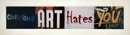 Maybe there should be a biker gang of contemporary art enthusiasts with Waters’s own Contemporary Art Hates You (2009) emblazoned on the back of a leather jacket. Another option could be a jacket covered with Waters’s favorite Cy Twombly’s “bad handwriting” art. Imagine roving bands of art lover-delinquents recreating scenes from Ryan Trecartin’s films in public places, terrorizing unsuspecting citizens.