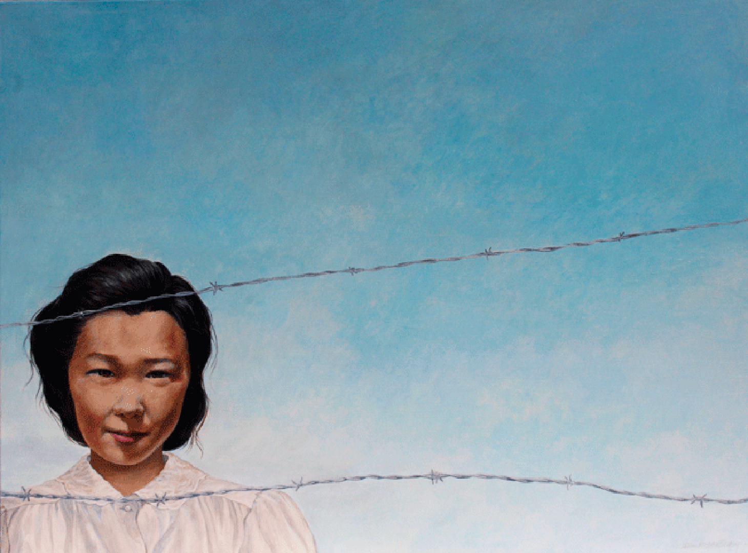 TORONTO — In a gallery of the Royal Ontario Museum hangs a series of portraits depicting colonial Canadians, decked out in their fineries. They gaze proudly from their ornate frames: women draped in furs and ribbons, men dressed in stiff-collared shirts and military regalia, rosy-cheeked girls in billowy dresses with thick pink sashes. At the center of this wall — a testament to European influences on Canada — is a strikingly different portrait. Painted onto a large stretch of canvas, a young Japanese woman, her face framed by a powder-blue sky and two strands of barbed wire, holds our view.