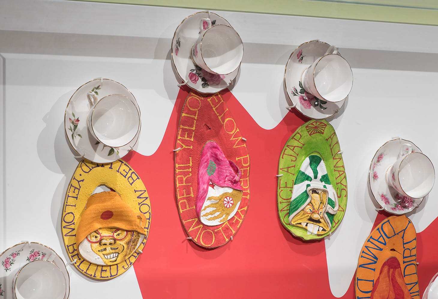 The most overt expression of the painful legacy of the internment can be seen in an installation by David Hayashida, a ceramic artist from the province of Newfoundland. His work, “ Low tea in ‘43 (British Columbia) still boils,” consists of china teacups fixed to the points of a lopsided maple leaf. From each cup — a symbol of British authority in Canada — drips a ceramic puddle painted with grotesque caricatures of Asian men and jarring historic quotes pertaining to their internment. “No Japs from the Rockies to the seas,” reads one such quote, uttered by a Member of Parliament in 1944.