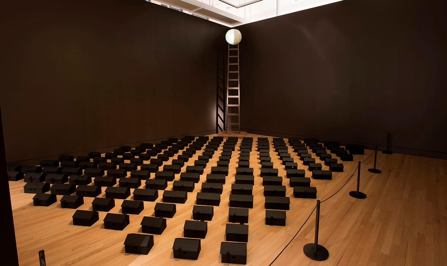 Looming over the shacks is a second installation by Nunoda. A ladder climbs up the gallery wall, crowned by a glowing, moon-like orb that casts a glow over the shacks below. Aptly titled “Ladder to the Moon,” (2013) the work was inspired by a conversation Nunoda had with his daughter, who asked if it would be possible to build a ladder that could reach the celestial body hovering in the night sky. Positioned over the miniature internment camp, as though offering a way out of that dark world, the installation takes on a poignant symbolism as the hope of a displaced generation.