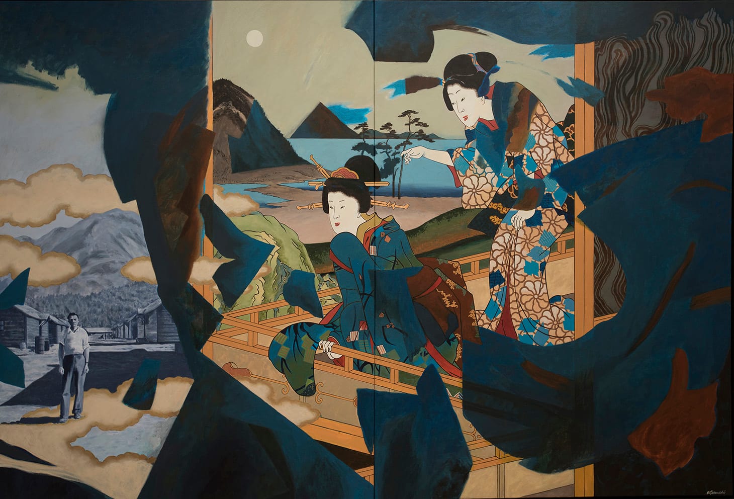 By focusing on contemporary reactions to this era of injustice, the exhibition highlights the long-standing ramifications of the internment — ramifications that have rippled across generations and complicated notions of what it means to be a Japanese Canadian today. All of the eight featured artists either experienced Canada’s internment policies directly or have relatives who were impacted by them, according to Yamashita. The young woman surrounded by barbed wire in Lillian Michiko Blakey’s portrait, for instance, is the artist’s mother, who was sent to work on a sugar beet field in the province of Alberta. Eighty-one-year-old painter Norman Takeuchi and his family were forced to move from Vancouver to the interior of British Columbia. He contributes a vibrant work that juxtaposes two images: a traditional Japanese woodblock print of two women in luxurious kimonos, and a muted depiction of a man standing between rows of internment camp shacks. Framed by jagged abstract shapes, these two aspects of Takeuchi’s identity — his ancestral heritage and the era when that heritage made him a target of oppression — collide uneasily.