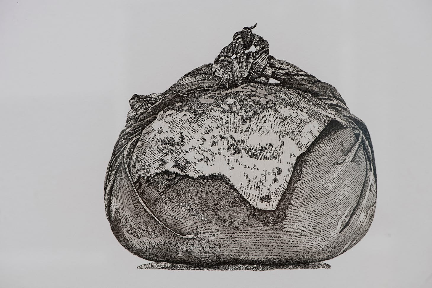A similar approach drives her second piece, “Collected Stories,” which features etchings in the shape of furoshiki, a type of traditional Japanese packaging used to transport food and gifts. These works are comprised of text, which relate the stories of Nishimura’s family members and other individuals she encountered during her research. Their memories are thus woven into the layers of the furoshiki bundles, as if to hold and protect them. But crucially, the texts are tiny, almost impenetrably so, representing the difficulty of fully reconstructing stories that have been repressed for decades.