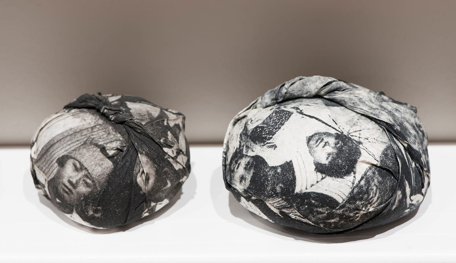 Nishimura’s third installation, “An Archive of Rememory,” renders the furoshiki in sculptural form. On five narrow shelves sit dozens of little bundles printed with family photographs from the internment era. Black-and-white photos of faces peer out from the folds of the furoshiki, which, unlike their traditional counterparts, are empty and cannot be opened. “These pieces look heavy … but they actually weigh nothing,” Nishimura says. “And I loved this idea of playing with the notion of the weight of memory.” The legacy of her grandparents’ experiences feels at once ethereal, having been obscured by years of silence, and impossibly heavy, as she carries their painful pasts with her into the present.