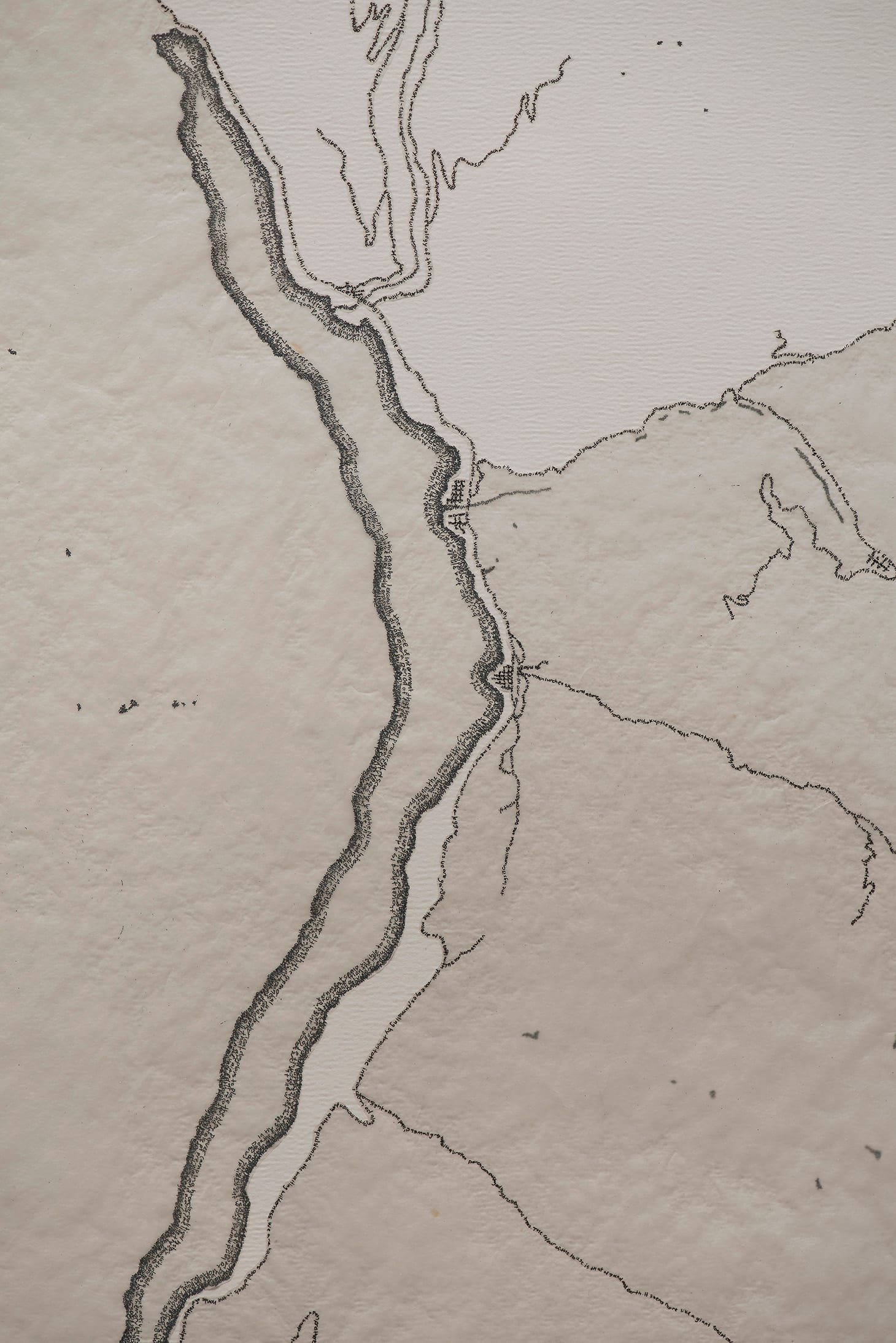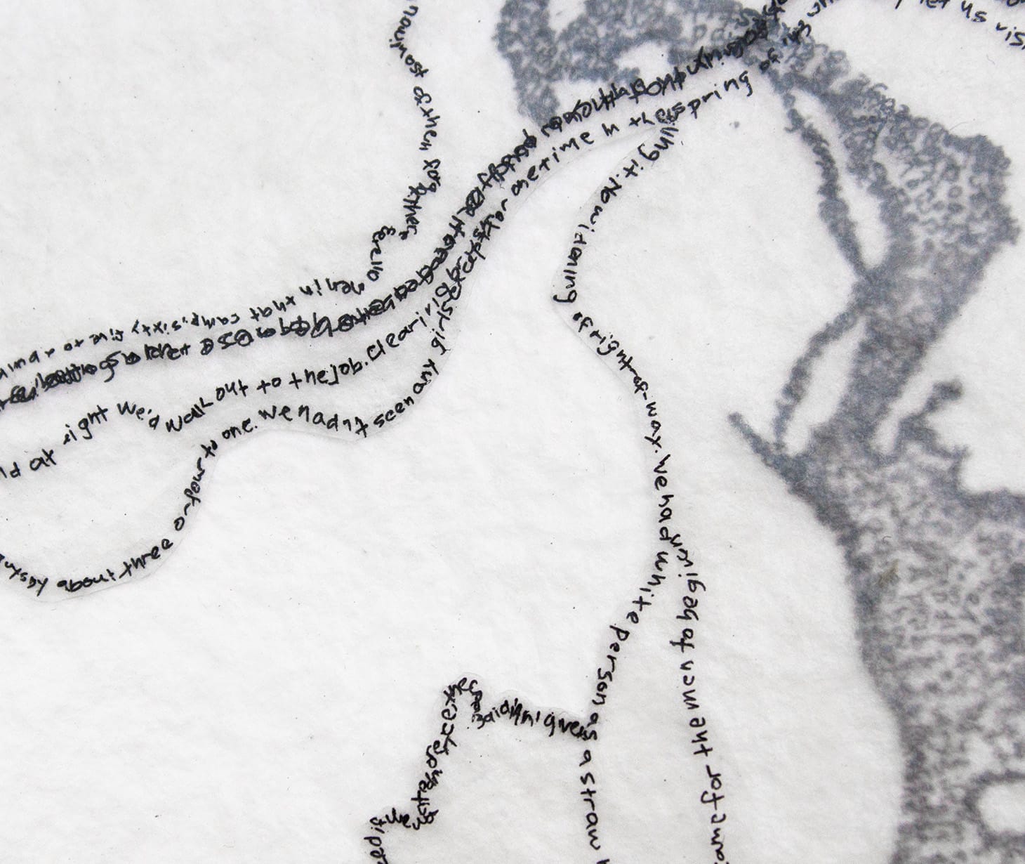 Around ten years ago, she began trying to fill in the gaps. She read history books on the internment, spoke to family members about her grandparents’ experiences, and interviewed other survivors about this historic event that upended their lives. The information Nishimura uncovered inspired three artworks on display at the ROM. The first, “Constructed Narratives,” is a series of maps depicting locations connected to the internment period, including the section of road that Nishimura’s grandfather worked on during the war. The maps’ topographical lines are etchings made up of minuscule texts, drawn from historic and contemporary sources that shaped Nishimura’s understanding of the interment era.