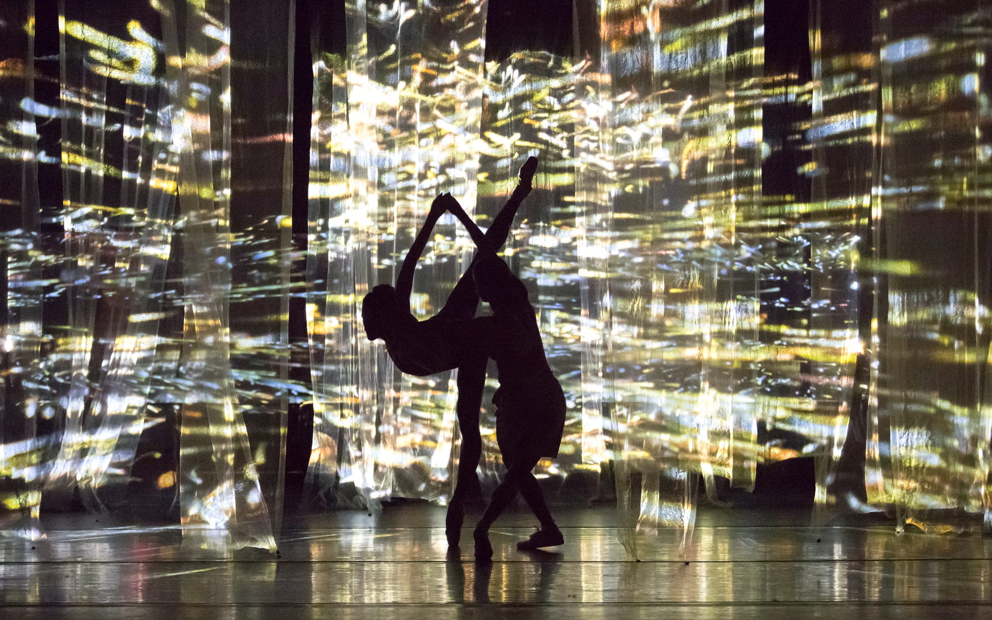 Although the first half of the program is inspired by visual art, it’s the longer science-fiction piece in the second half, “Translation,” that’s the most visually driven. “Translation” almost feels like a live painting in itself. The stage lights are off, and lengths of scrim hang all over the stage with projections of light painting moving across them — a surreal environment created by designer Sergio Mora-Diaz. As the dancers move through this almost magical space, the audience sees them only as silhouettes. In the corner, Julianna Barwick performs her serene original compositions on an electric keyboard, at times inflected by her eerie singing and whistling.