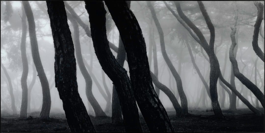 The theme of “reflection” includes images that seek to capture timelessness. Some artists achieve the effect through manipulations of environments. For example, Bae Bien-U’s “snm5a-012h” (2015) portrays a pine forest, created by photographing different parts of the same landscape in various seasons or times of day. Bae symbolically addresses the theme of timelessness with the pine tree, which represents longevity across East Asia.