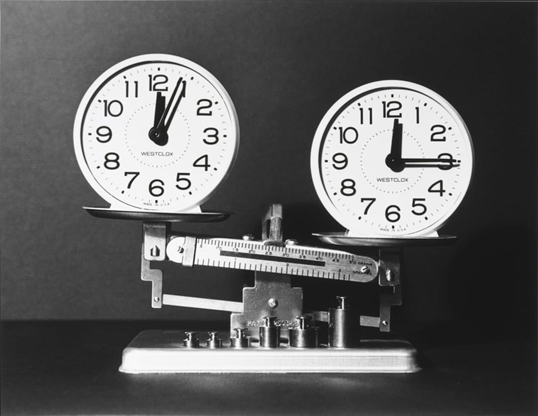 “Time (B)” (1980) by Japanese artist Kenji Nakahashi starts off the exhibition on a cheeky note. The photo depicts two alarm clocks on a scale, with the clock at 12:15 heavier than the one at 12:04. Although the imbalance is laughable and impossible, it introduces the indisputable truth that time is subjective.