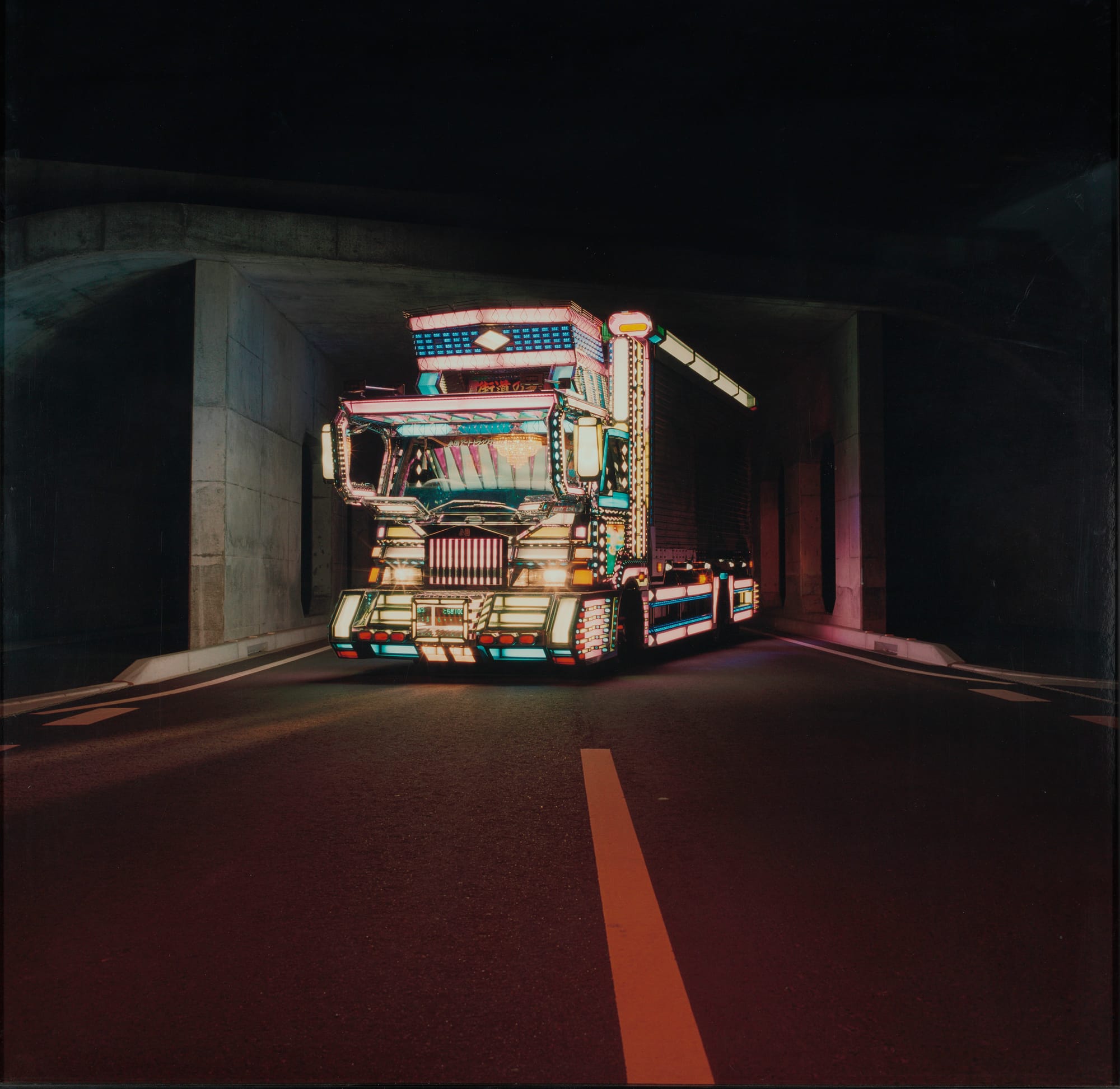 Masaru Tatsuki‘s image “Tenkamaru in a Tunnel, Tochigi 2005,” from his Decotora series, refers to “Tenkamaru,” the name of the decorated truck in the picture. It represents Japan’s decotora subculture that celebrates transport vehicles by embellishing them with colorful lights. This photograph commemorates the 10 years that the artist spent within the subculture. He explains his involvement in the accompanying text, stating, “it simply takes time to really understand something.”