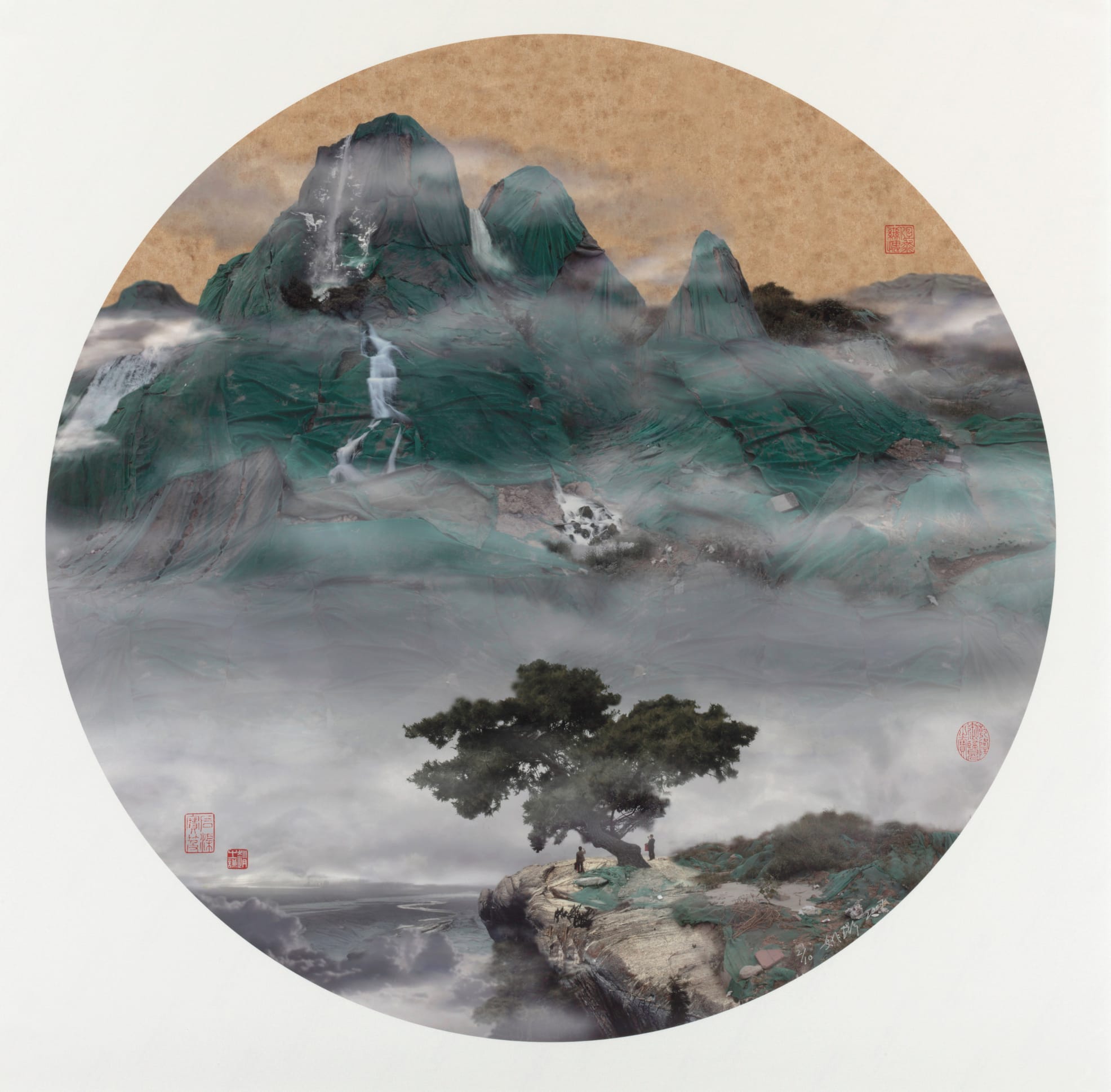 Yao Lu’s “View of Waterfall with Rocks and Pines” (2007), in the “Progress and Place” section, exemplifies the oblique criticisms that many Chinese artists have raised about China’s path toward “progress.” This work demands that the viewer look closely: what appears to be a scene of a mist-shrouded mountain, waterfall, and trees — a nod to traditional Chinese landscape painting — is actually a landfill or construction site draped in green mesh, which helps prevent erosion and the spread of harmful dust. As the accompanying text notes, the work poignantly contrasts China’s present endangered environment with its rich artistic past.