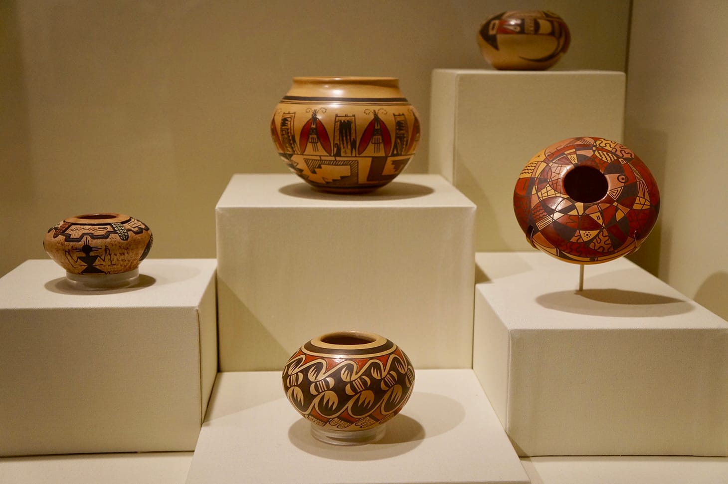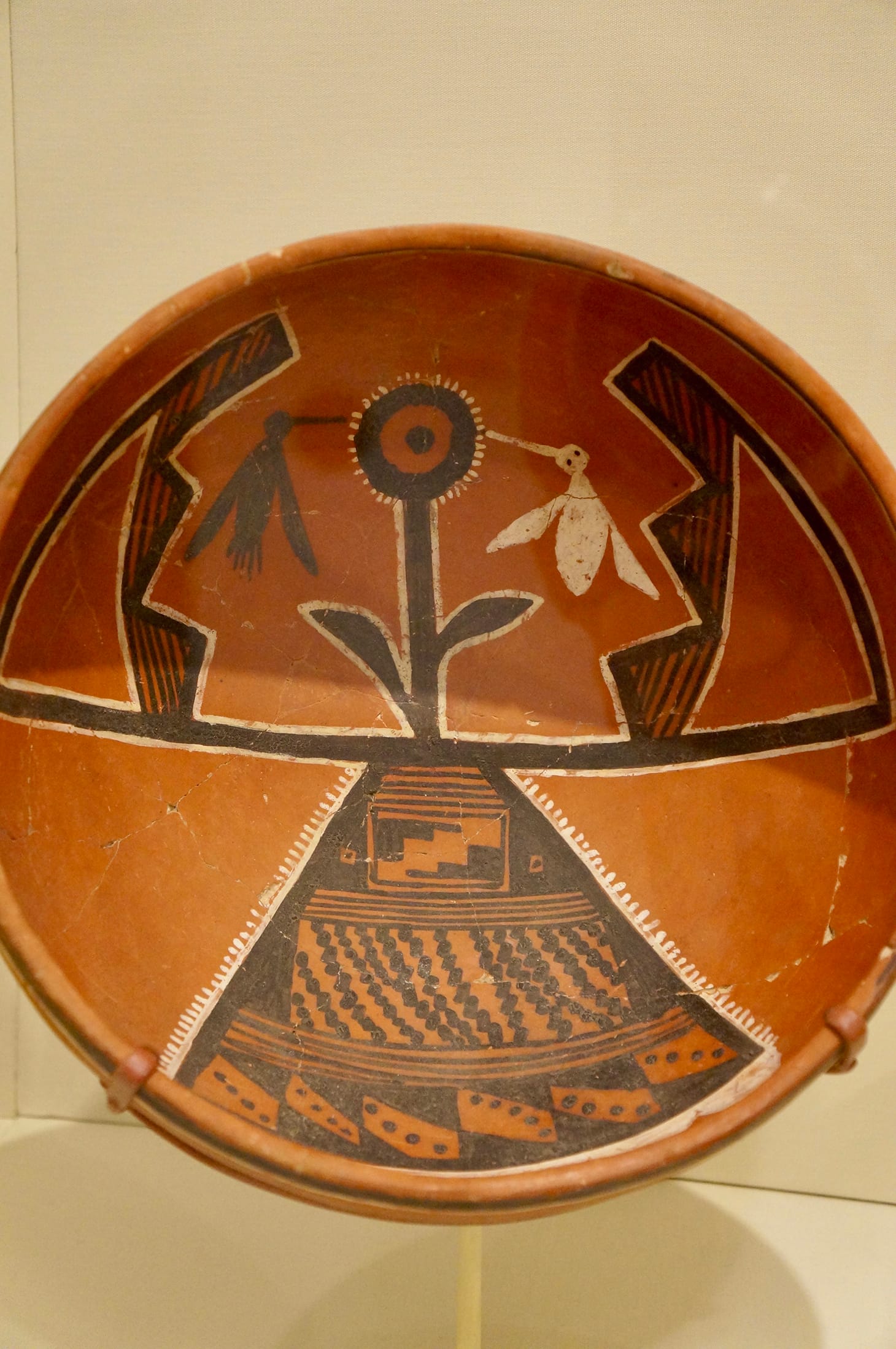 Although the Journey of the Human Spirit is the focus on the exhibit, other contemporary and ancient artifacts contextualize the deep communal history of the Four Corners area. Hopi Visions walks viewers through several specific symbols that appear as motifs in ceramics and murals. Indeed, from flowers to feathers to geometric designs, the exhibit makes the point that certain motifs have endured for centuries. Several of the ceramic bowls in Hopi Visions were iconic examples of the region’s art.