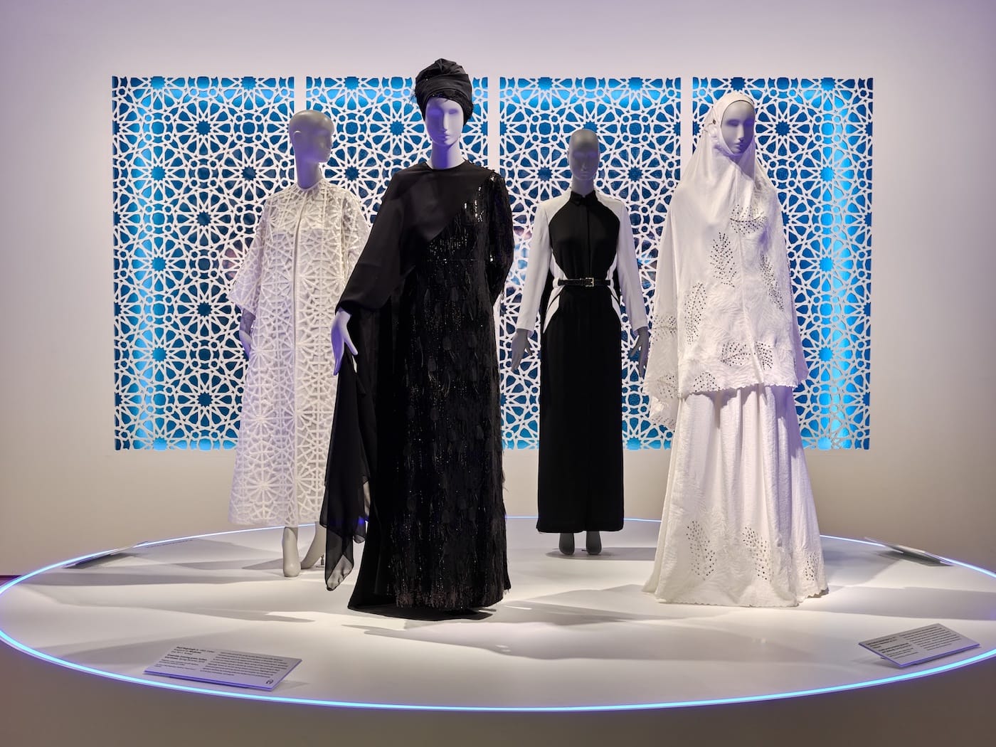 There are regional displays using mannequins wearing clothing from Muslim majority countries in the Middle East, as well as nations in South Asia, Southeast Asia, and Indonesia. There is a section on hybrid sports garments, including the burkini. And, finally, there is a staging of upscale Parisian fashion as it has been customized for Muslim women.