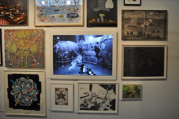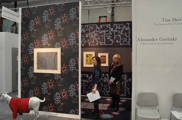 A salon-style wall at the Pierogi Gallery booth featuring Tavares Strachan’s “The Plunge #4” (201) in the middle.