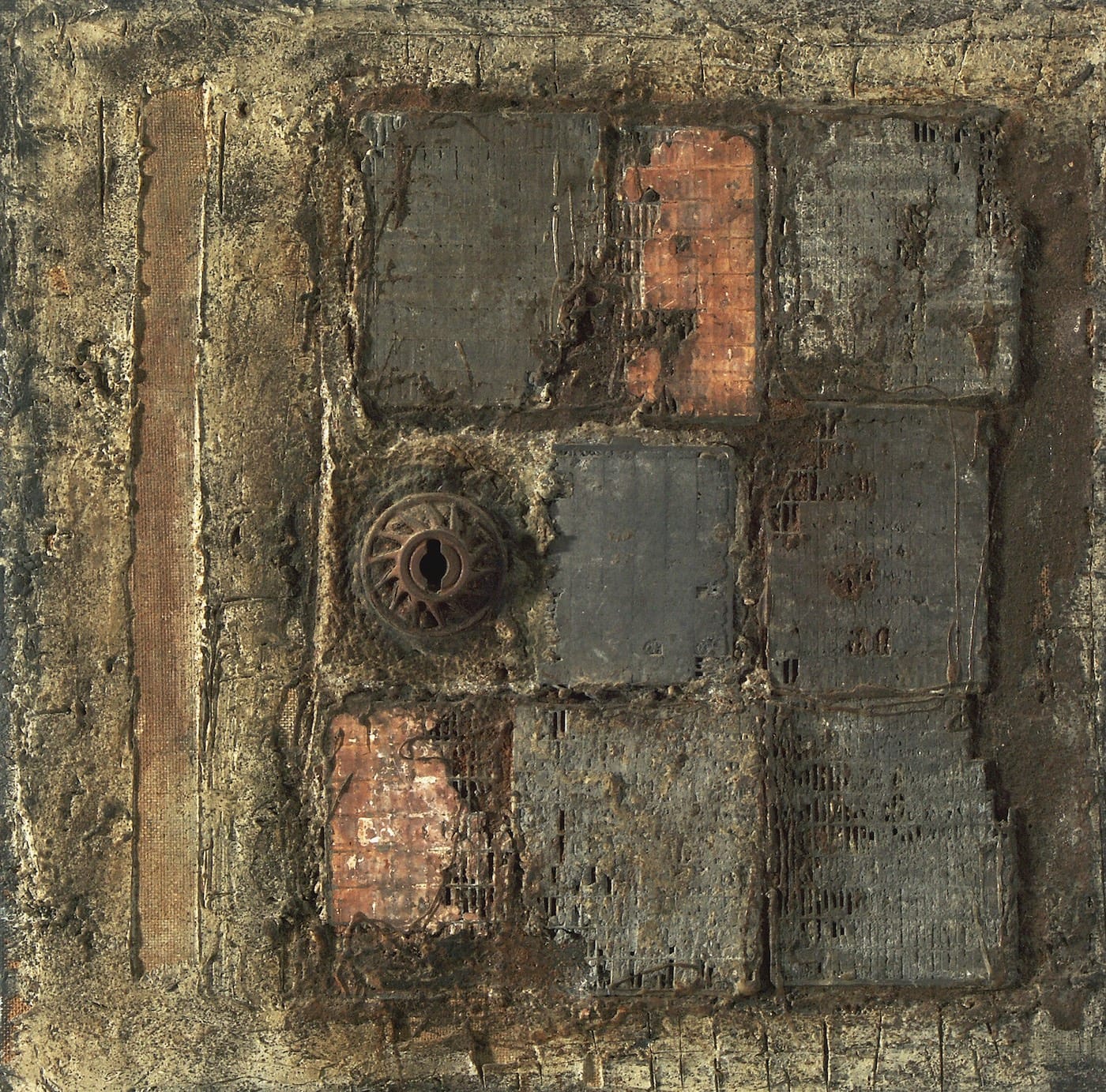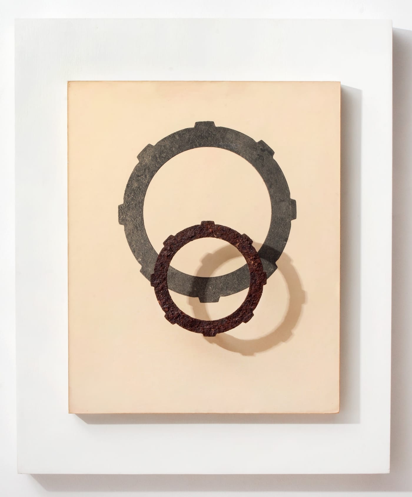 While her earliest works are geometric abstractions, they aren’t like anyone else’s. Made of repeated units superimposed onto a vertical spine, as in “Untitled” (1955), the asymmetrical, segmented forms are inspired by insects, machine parts, and totems. By 1960, Gramcko has moved in a totally different direction, making monochromatic textured works marked by circular or elliptical indentations. By 1962, she is working with rusted and distressed pieces of metal, arriving at a surface that looks decayed – a diseased skin. By 1963, she has incorporated parts of a car battery into the work as well as metal grating. By 1966, she was incorporating a car headlight into a textured surface, creating cyclopean assemblages.