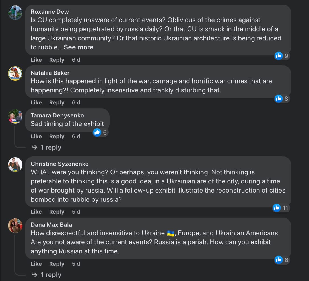 The Cooper Union announced the exhibition's opening on Tuesday, January 17 and shared it on the official university Facebook page the following day. Multiple Facebook users commented and shared negative reactions, calling the exhibition "inappropriate" and "disrespectful," citing the ongoing Russian invasion of Ukraine as well as the institution's location in the heart of New York City's Ukrainian Village.