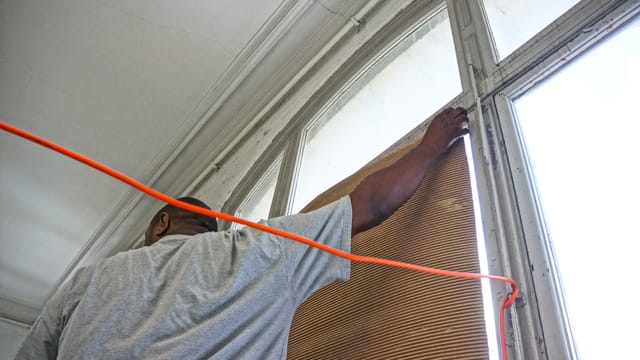 The red-and-white signs, giant versions of ones seen slapped on the outside of empty homes, are installed in the arching frames of the Corcoran School of Art’s facade windows. The project is the work of Judas Recendez, a student at the school, according to the Corcoran Student Council’s fine art representative Katherine Macyshyn (class of 2013).