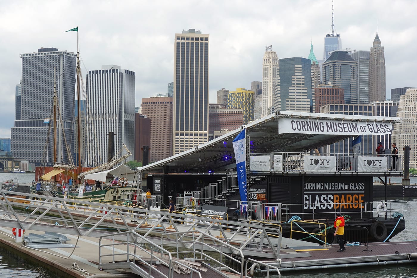 Corning Incorporated started in 1868 as the Brooklyn Flint Glass Company, located in today’s Brooklyn Heights (just a short walk from Brooklyn Bridge Park). When the company relocated to Corning, New York, to be closer to raw materials, it used the waterways to move. There it expanded its operations, innovating glass for Thomas Edison’s lightbulb, Pyrex lab and kitchenware, and glass for touchscreens. Accompanying the GlassBarge is the Lois McClure, a replica of an 1862-class sailing canal boat operated by the Lake Champlain Maritime Museum in Vergennes, Vermont. The ship is based on two shipwrecks discovered in Burlington Harbor, Vermont, and it is a historic gateway into this connection between glass and the waterways. A 1964 tugboat from the museum is also part of the flotilla.