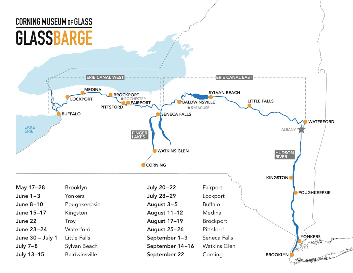 The journey on the New York waterways is timed with the Bicentennial of the Erie Canal, which broke ground in 1817 and was completely operational by 1825, connecting the Atlantic Ocean to the Great Lakes. It also highlights the long connection between the waterways and culture and industry in the state. After navigating the Hudson River, the GlassBarge will go west along the Erie Canal from Albany to Buffalo, before ending its water tour in Watkins Glen in the Finger Lakes. A last leg of the trip will be by land, and culminate with a September 22 celebration in Corning, home of the CMoG. (The canal section there is no longer accessible.)