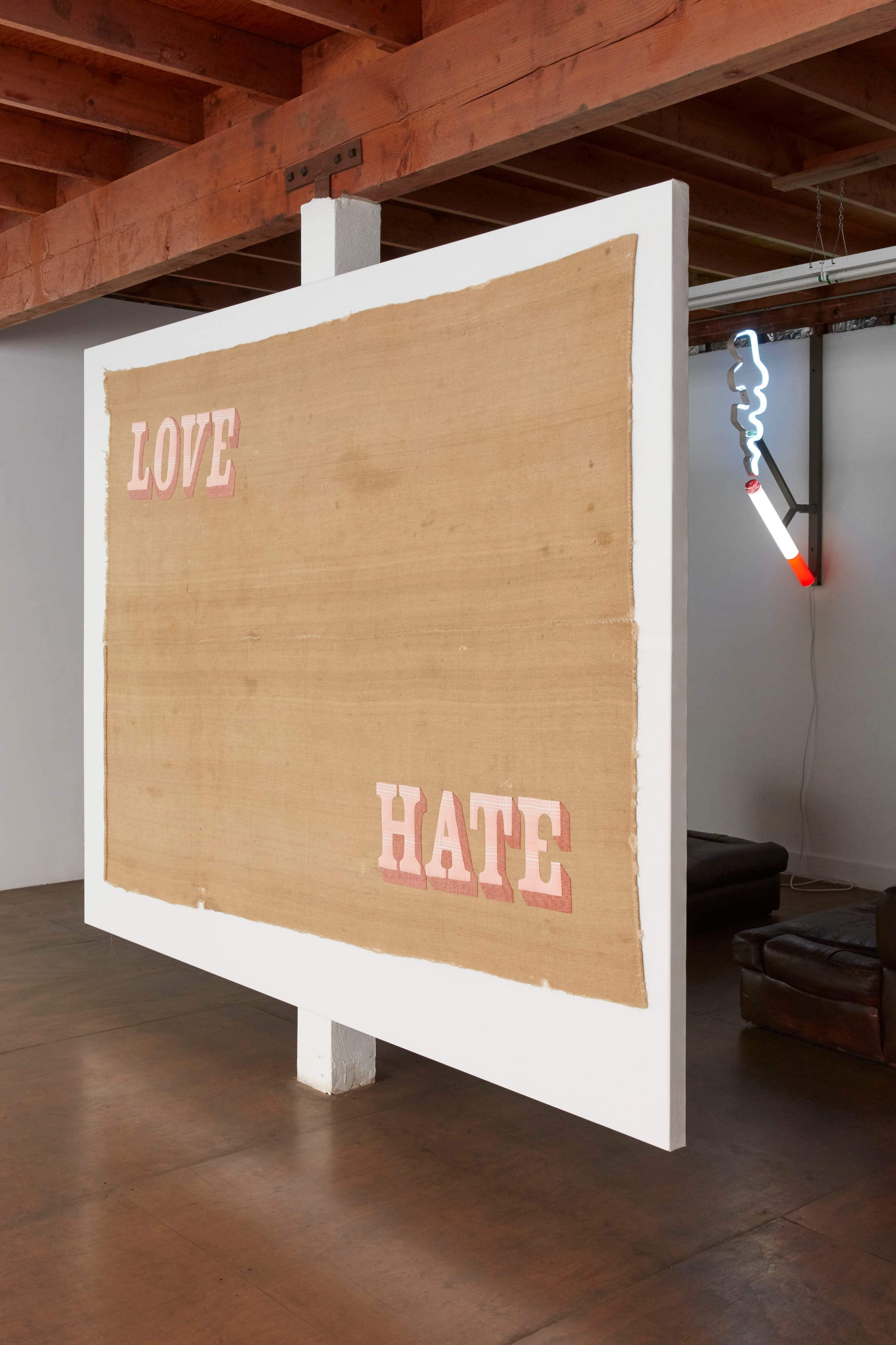 The first work encountered upon entering is “LOVE/HATE” (2011), a jute banner printed with the two words in opposite corners, behind which a neon cigarette, “Smoke” (2008), hides. (All other works 2020.) These clear-cut binaries produce less a feeling of tension than a sense of balance, reducing the idea of “difference” — signified by “hetero-” — into neatly packaged opposites.