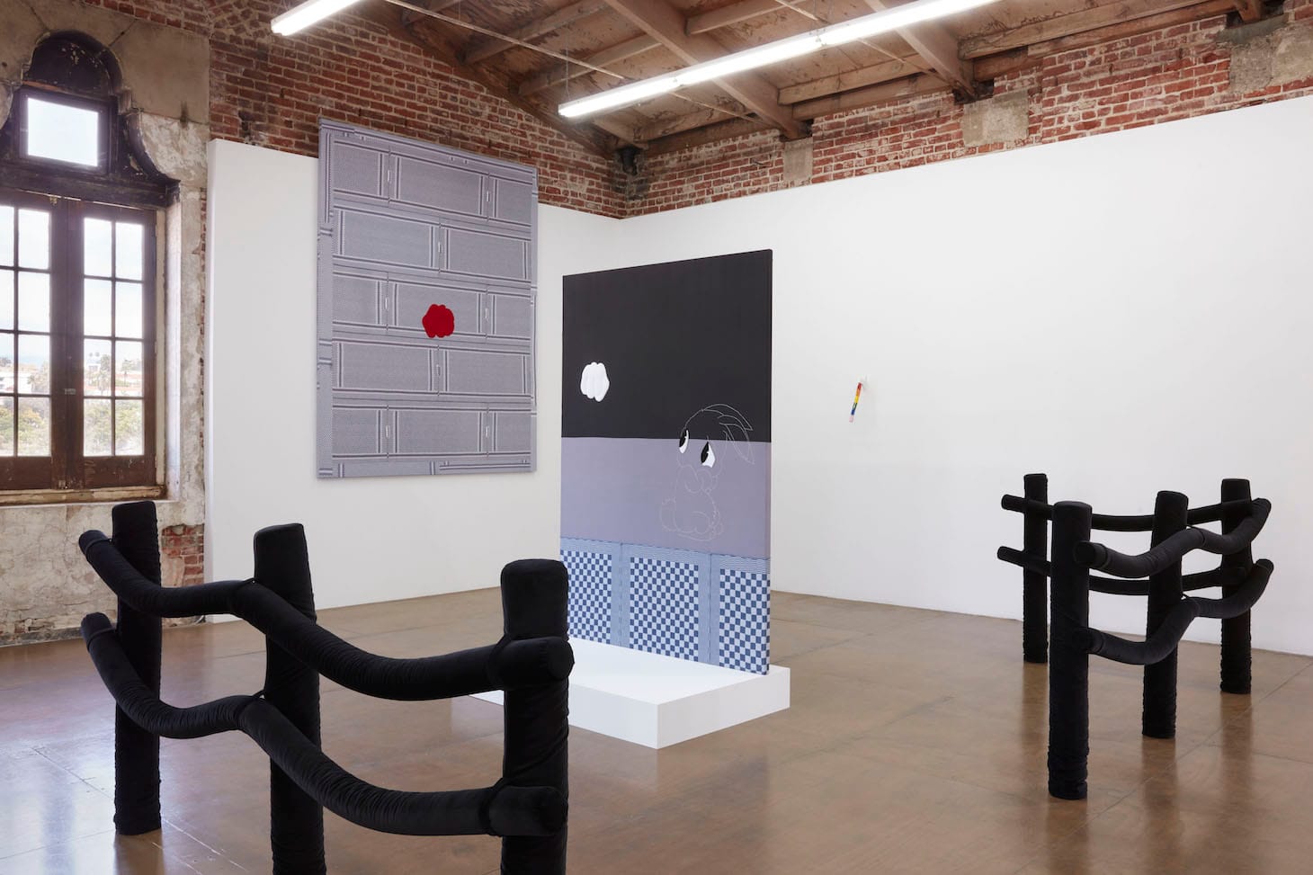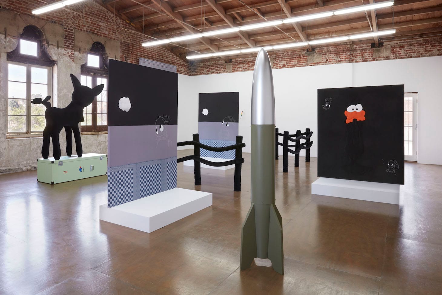 Accompanying these works in the main gallery are textile collages and a selection of sculptures, including two human-scale rockets (“The Loser (black and white version)”; “The Loser (green silver version)”) and three soft fences made of stuffed black velvet.
