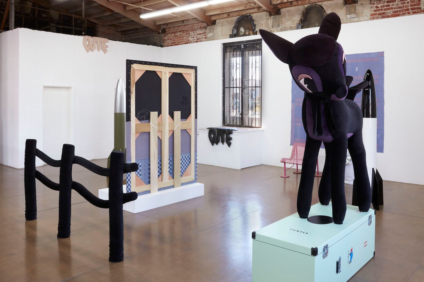But the interplay of signifiers is never that simplistic in a von Bonin show; two puffy signs that read “cute” (“Cute (pink)” and “Cute (black)”) unsettle this balance. The signs, which seem to be melting, are not particularly cute, but nearly everything else is — not least the title work, a large, Bambi-esque fawn standing on a mint-green trunk (“Hetero”), and a tableau named for the gallery’s neighborhood (“MacArthur Park”), composed of a blue wall hanging, a pink bench for one, and a canvas bin jammed with stuffed Bugs Bunny dolls.