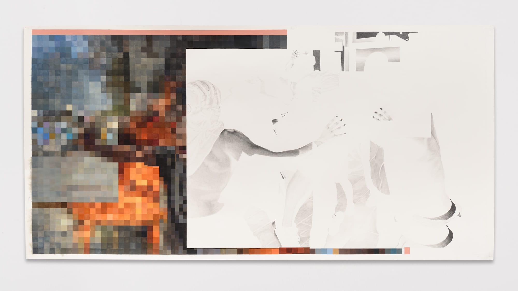 Whyte’s work exists in the gap between that which is archived by history and that which is actually remembered. Instead of depicting people and moments in their entirety, he merges images and obscures crucial details, making the figures hard to parse. In the painting "Agitation 9-Conductor" (2024), for instance, pixelated orange squares on one side of the canvas suggest a fire. On the other side, a shock of white obliterates part of the image. What is shown is all the more striking as a result: a reaching arm, running feet, and a turned body — the moment is tense but undiscernible. Similarly, the painting "Agitation 2 - Wailer and the Griot" (2023) depicts a wizened hand in an otherwise pixelated scene clutching a shirt, tension evident in the veins thrumming under the deep brown skin. The pixelated scene behind the figure suggests more fire and smoke, but the image superimposed on top — a black-and-white drawing of a person in a headstand — suggests a more playful scene. The contrast between them is striking: the technicolor present and the black-and-white past.