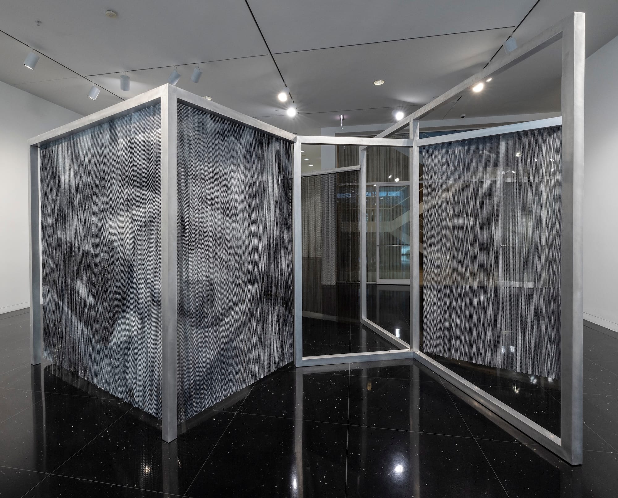Whyte’s metallic structure "4x4 Timing/Hush Now, Don’t Explain" (2023), inspired by his late father's architectural drawings, opens the exhibition, presenting doorways to memories. The elegant and daunting artwork resembles a massive tri-fold picture frame; in place of the black and white photographs it usually contains, however, are portraits hand-painted on beaded curtains. Viewers are invited to walk through these portals, the heavy beads whispering and clattering with the movement. Seen from a distance, one of the curtains depicts young men lying stretched out, their hands behind their heads; up close, however, the picture is completely indecipherable.
