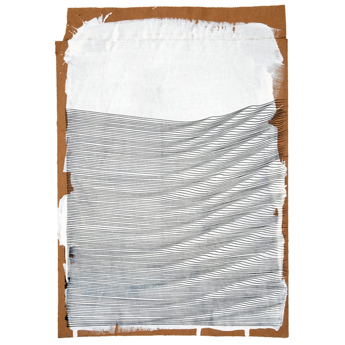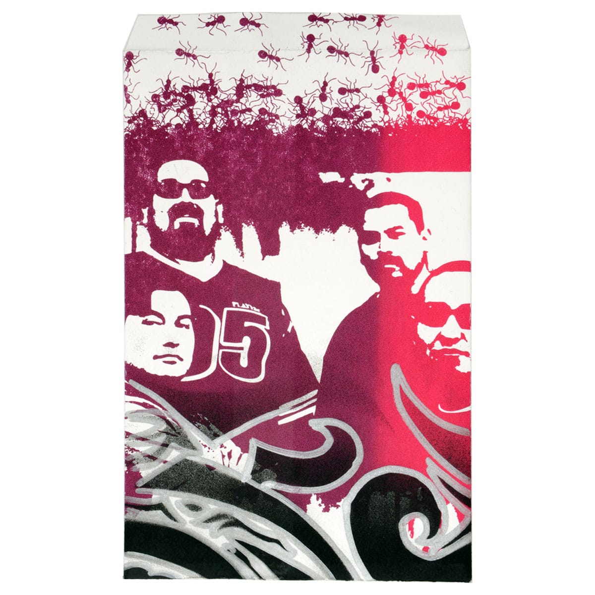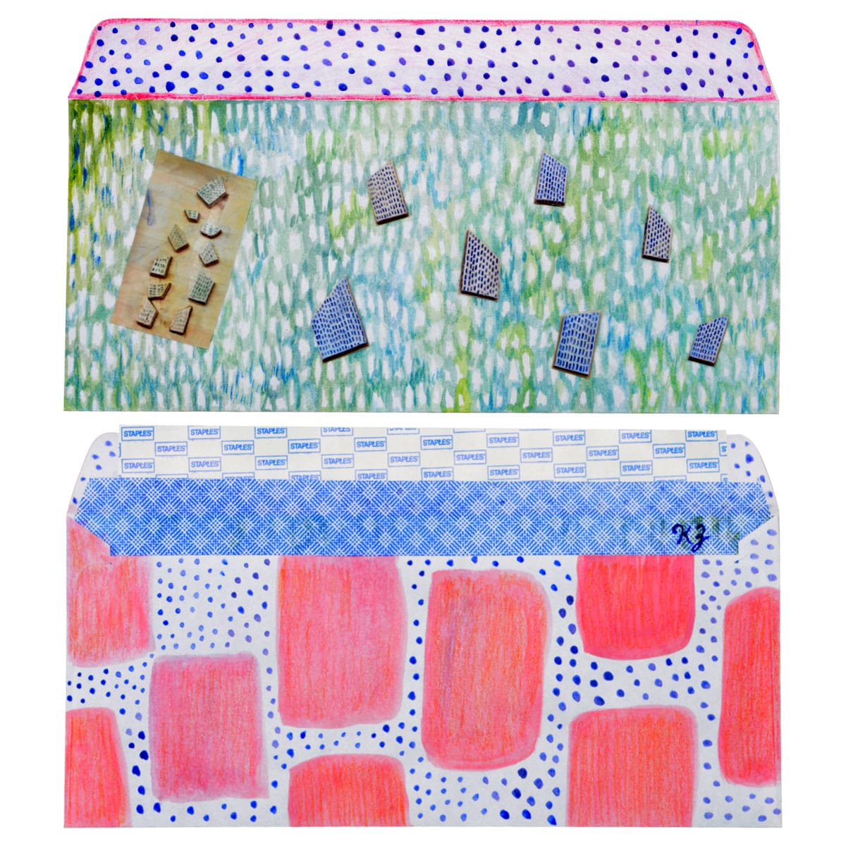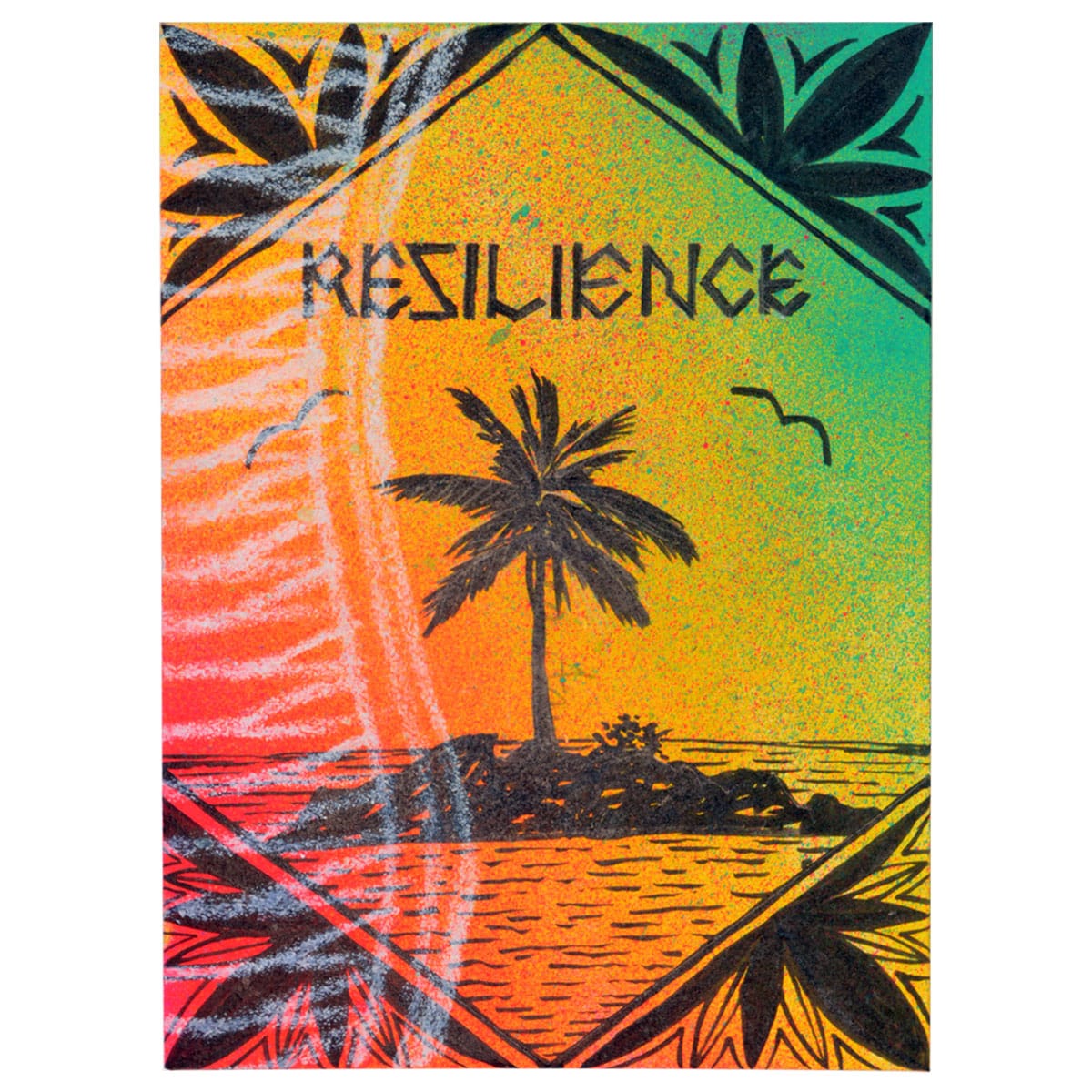 On another envelope, muralist JP Pereira has spray painted a red, yellow, and green gradient. In black, he stenciled a floral border, a lone palm tree on a tiny island, and the word “resilience,” also the title of the work. He finished with wavy white lines, a traditional Samoan design.