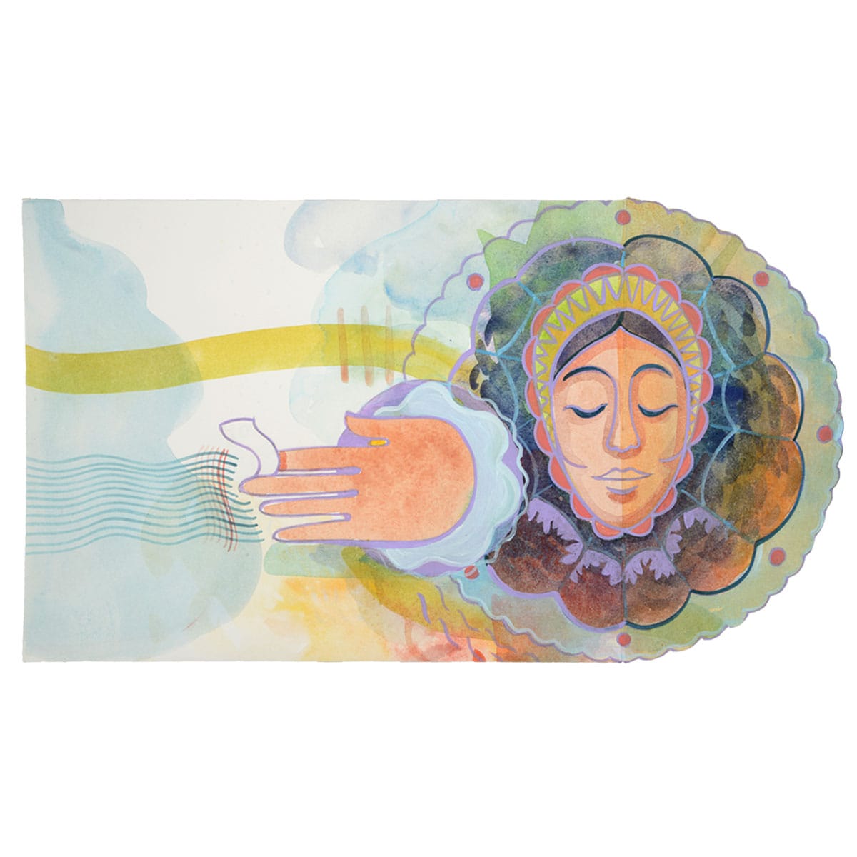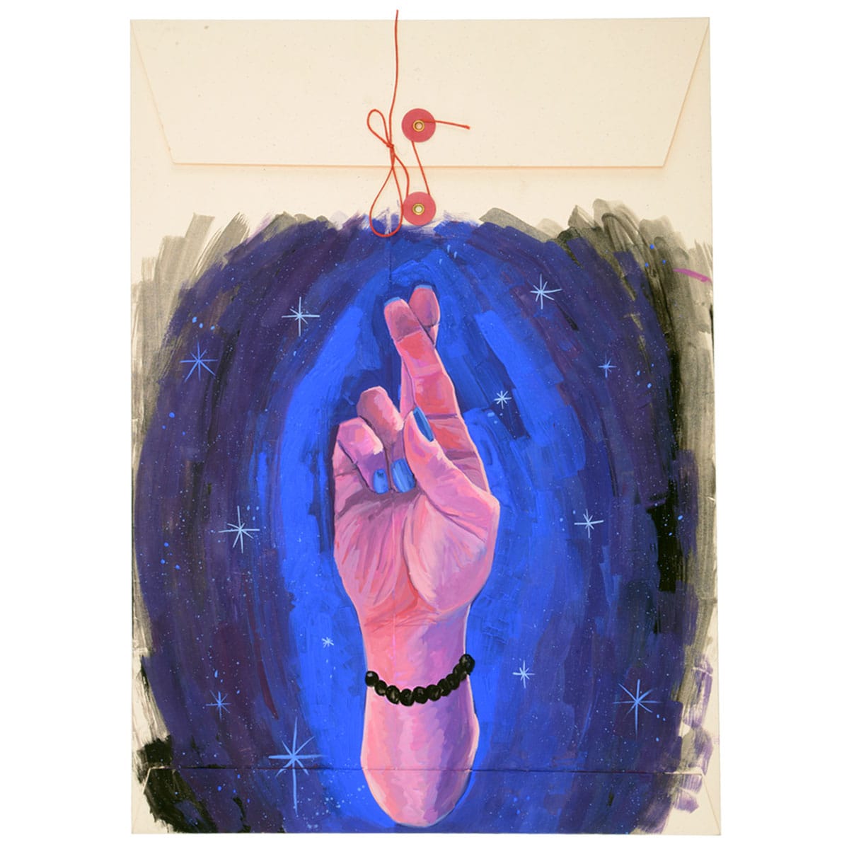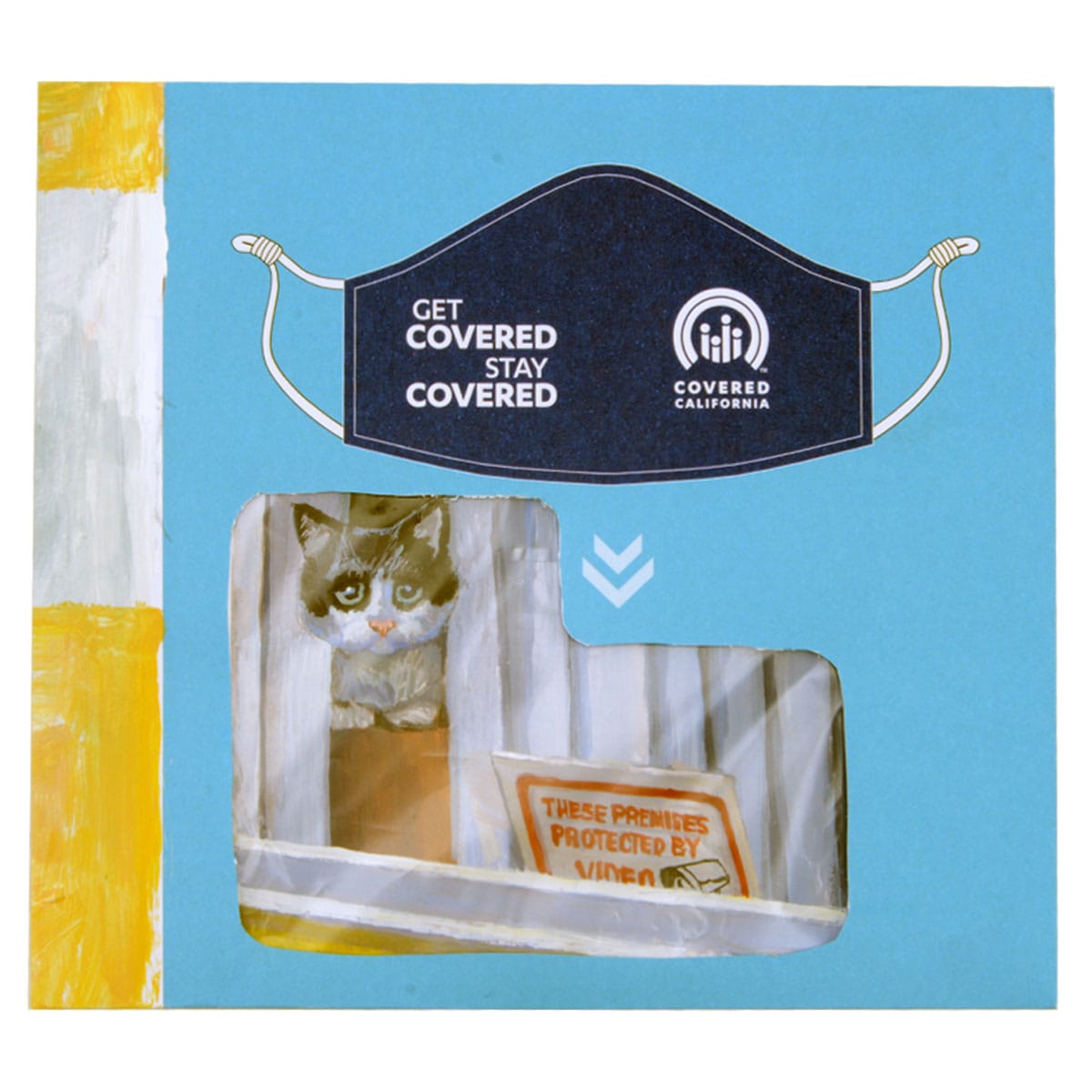 You can peruse the delicate envelopes online, and just through their titles, you can discover artists’ experiences in the pandemic. In “The Shut In Society 1,” a cat peeks out from the slats between plastic blinds; the window frame is not just an acrylic painting, but also the real, clear poly liner on a blue envelope. Painted above the cat is a Covered California-branded face mask — a freebie the state-run health insurance marketplace likely sent to artist Catherine Kaleel last fall.