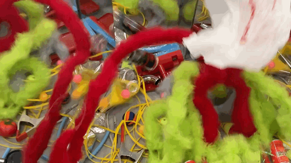 One of the most striking works is “The Sin Park” (2019) by the Chinese multimedia artist WANG Chen, an animation that combines digital video, 3-D game design, drawings, and performances by the artist herself wearing hand-sewn costumes. In a color-drenched, pixelated dreamscape resembling the interior of a kaleidoscope, a trope of furry characters and abstract creatures move slowly to hypnotic beats.