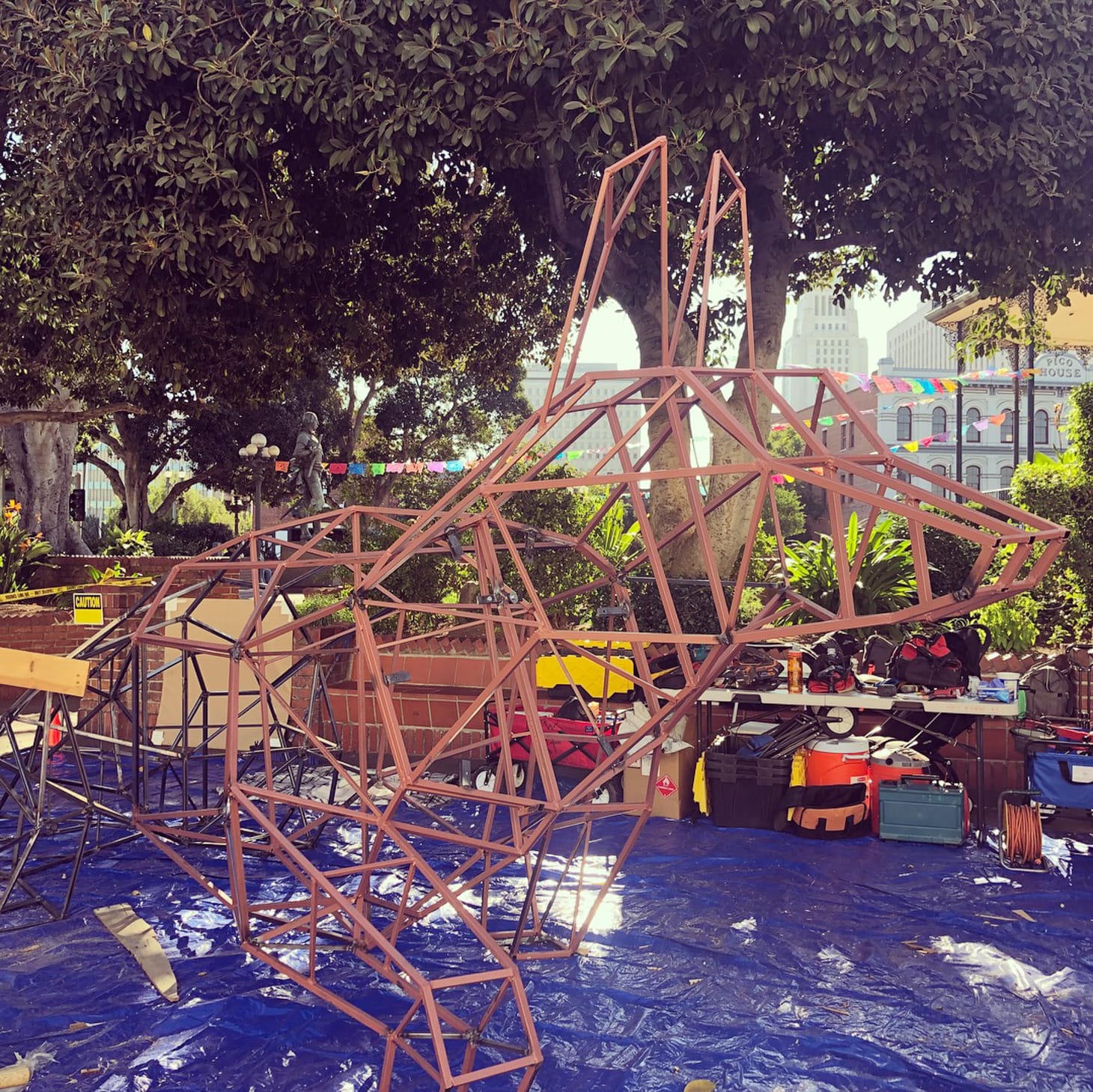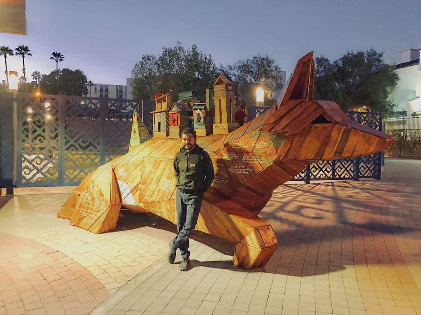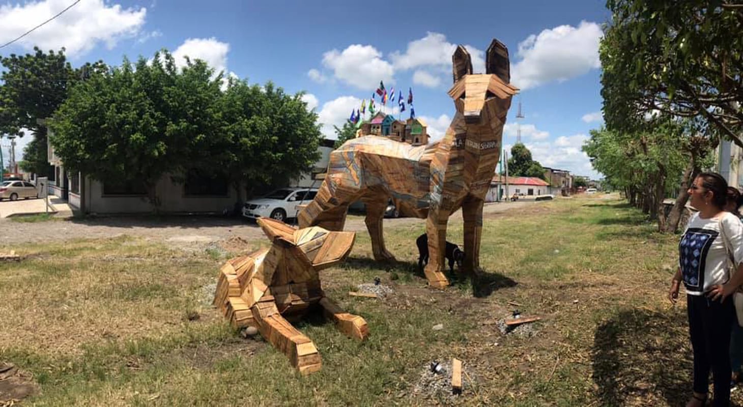 In Tapachula, Chiapas, Gutierrez created a mother and cub coyote after his experience on “La Bestia” alongside families traveling with small children and due to his desire to show the female perspective. The mama coyote stands at almost 11 feet tall and looks down protectively at her cub. On the top of her back sit colorful homes that double as birdhouses, sporting flags representing countries affected by the migrant crisis. Through the partnership of the organization Sin Fronteras, Gutierrez was able to work alongside migrants from four other countries on the Tapachula sculptures. “Transpoartapueblos: Los Resilientes,” which is part of the series and was created in partnership with NOW Art LA and the Museum of Social Justice, sits outside the LA Plaza de Cultura y Artes in Los Angeles.