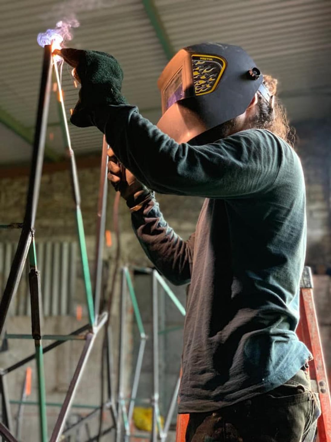 Gutierrez initially planned to share the information that would be helpful to migrants on large signs that he would place along the trail through Mexico, but when he received an unexpected grant from the Kindle Project in 2016, he decided to create coyote sculptures. He had been paining coyotes since his college days, so he was familiar with the image that he wanted to create. To Gutierrez, the transition from painting murals to constructing large sculptures felt natural because of his background in architecture. “I’ve always felt that I’m more of a sculptor than a painter,” he says. He sketches each design and then uses computer-aided design (CAD) to create a floor plan before welding the metal base, often from tall heights and shaky ladders. The frame is covered in slabs of recycled wood, which is “tattooed” with a map of Mexico on one side and resources available to migrants on the other. Shelving inside the tail serves as a collection center for supplies. Each design is unique and the information shared is specific to the statue’s location. “I hate when you go to a museum and you can’t get close to a piece. My sculptures are contrary to that — I want people to write on them and leave messages,” he explains.