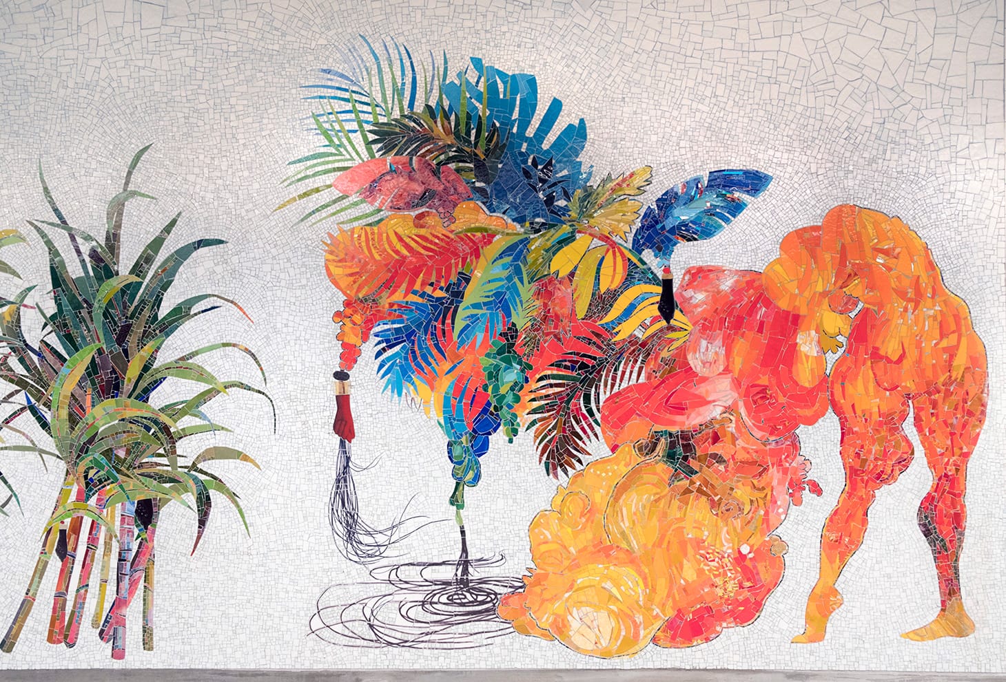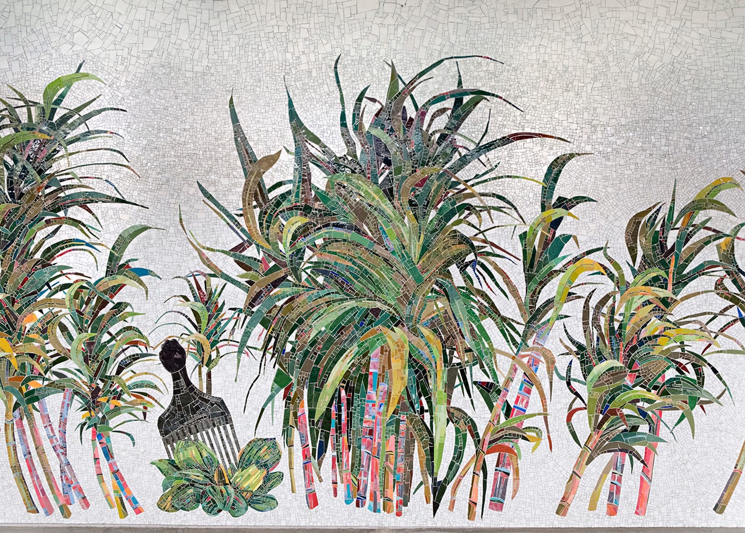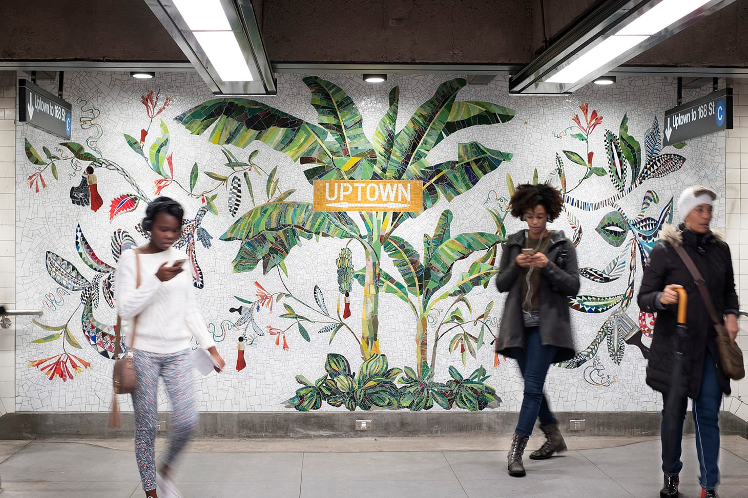 Patchworks of brilliant periwinkle, coral, cyan, canary yellow, and papaya orange-red tiles make up the stalks beneath teal, turquoise, and pistachio leaves. Amidst them, a hair pick of charcoals, mochas, and ash grays with a handle resembling a fist stands poised in a leafy base. The intricate design by Firelei Báez resides not with her artworks at the Studio Museum of Harlem or MoMA, but in Washington Heights’ 163rd street subway. It’s one segment of Báez’s proposal commissioned by MTA Arts & Design for the station’s redesign. According to director Sandra Bloodworth, the organization, “constantly striving to reflect New York and all that it is,” curates sundry public art for the diverse city’s bustling hubs.