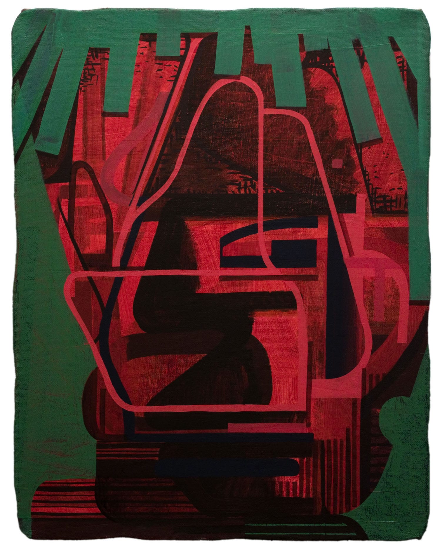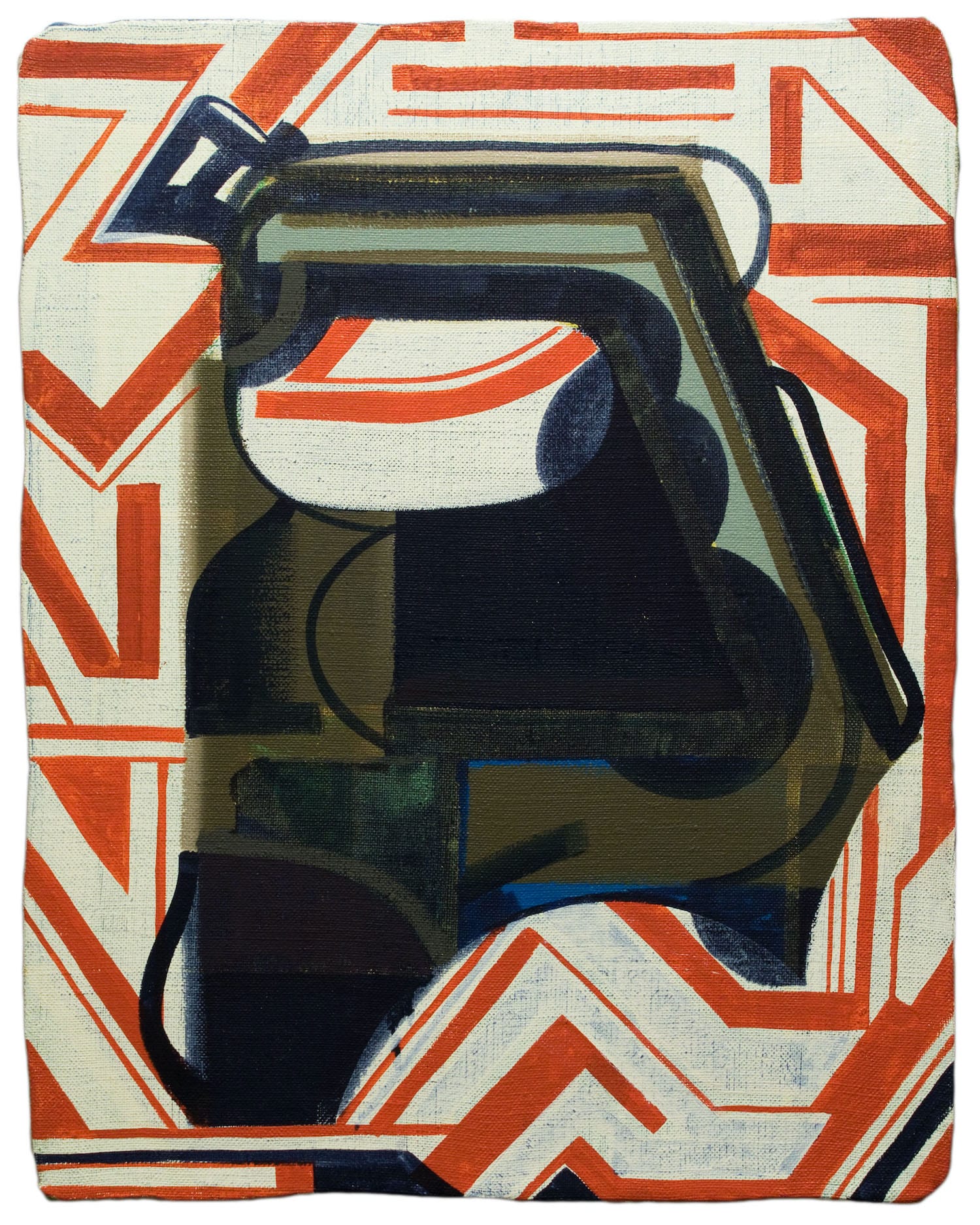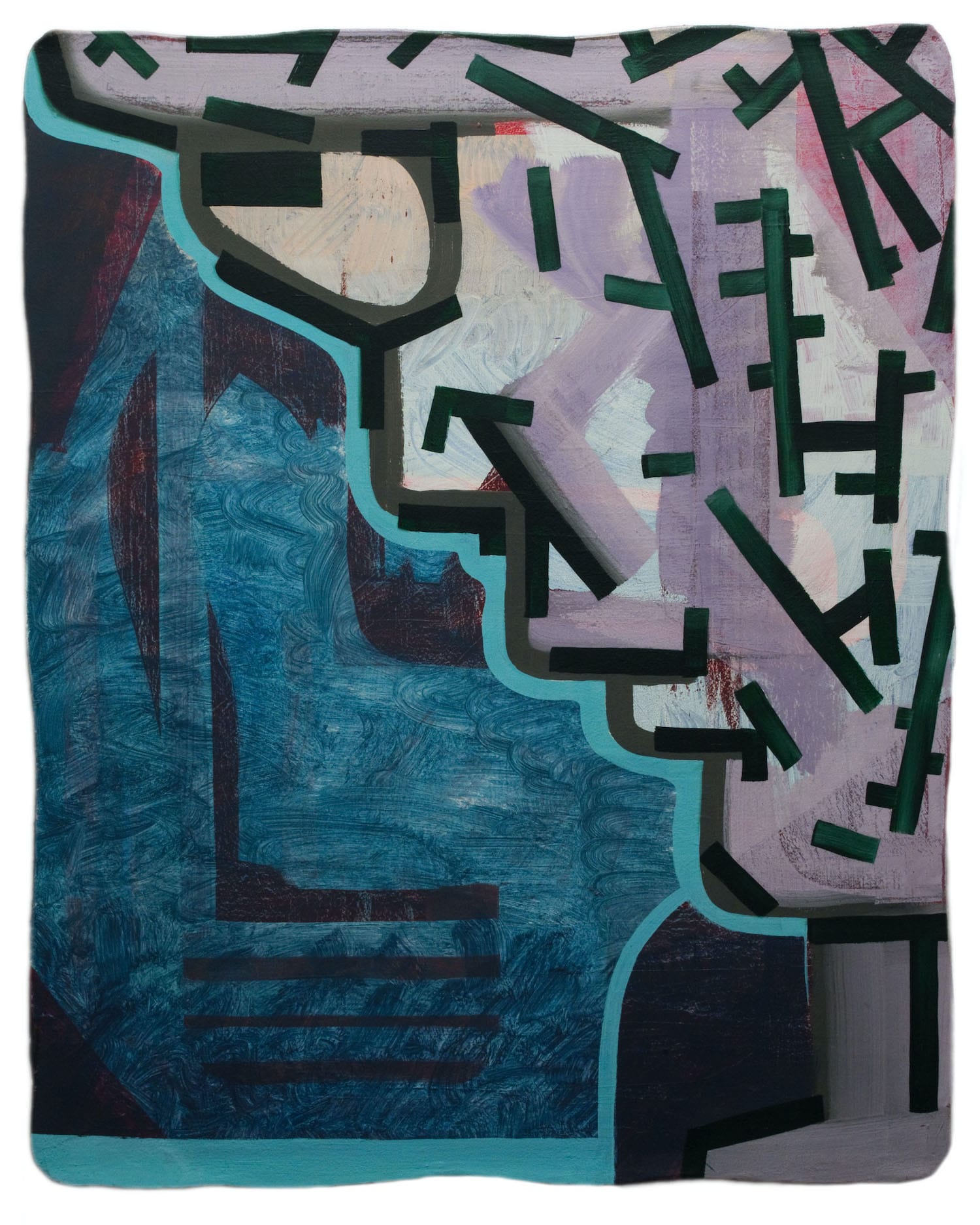 Along with working on surfaces that have wavering edges, Burckhardt has had a longstanding interest in pareidolia, or the way the imagination reshapes abstract images into something familiar (for instance, a face, bat, or gondola). This is the guiding principle of Rorschach ink blot tests. If the goal of art is to attain a state of pure opticality, Burckhardt rejects that in favor of an impure state of seeing in which the viewer is invited to complete the picture. The exhibition’s 17 paintings are portraits in which the abstract elements and forms suggest that we are looking at a head either frontally or at an angle. Burckhardt adds a dose of humor into the situation, as when he titles one of the paintings “You Should See the Other Guy.” Clearly, the artist did not embrace the belief that abstract art had to be serious.