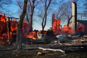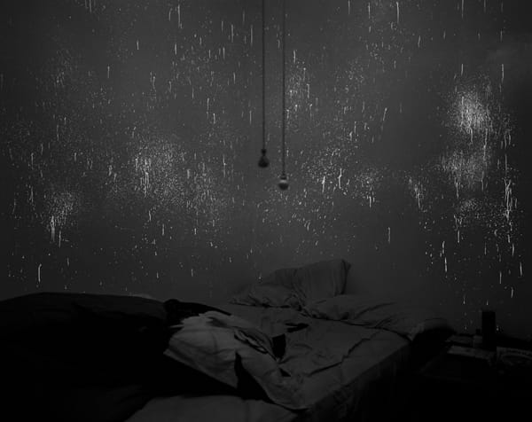 CHICAGO — I was standing in front of a large black and white photograph by Angela Strassheim in the Museum of Contemporary Photography, Chicago. It appeared to show the interior of a boring suburban home, complete with bad furniture and family photos in ugly frames. Everything seemed normal, nothing was out of place — except for the tidal splatter of white marks, like someone had hurled a can of paint at the walls.
