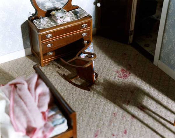 Turning from Patterson’s work to Corinne May Botz, we see images of brightly-colored rooms showing evidence of burglary or murder: blood on the carpet, a figure lying face down, the contents of a desk spilling out onto the floor.