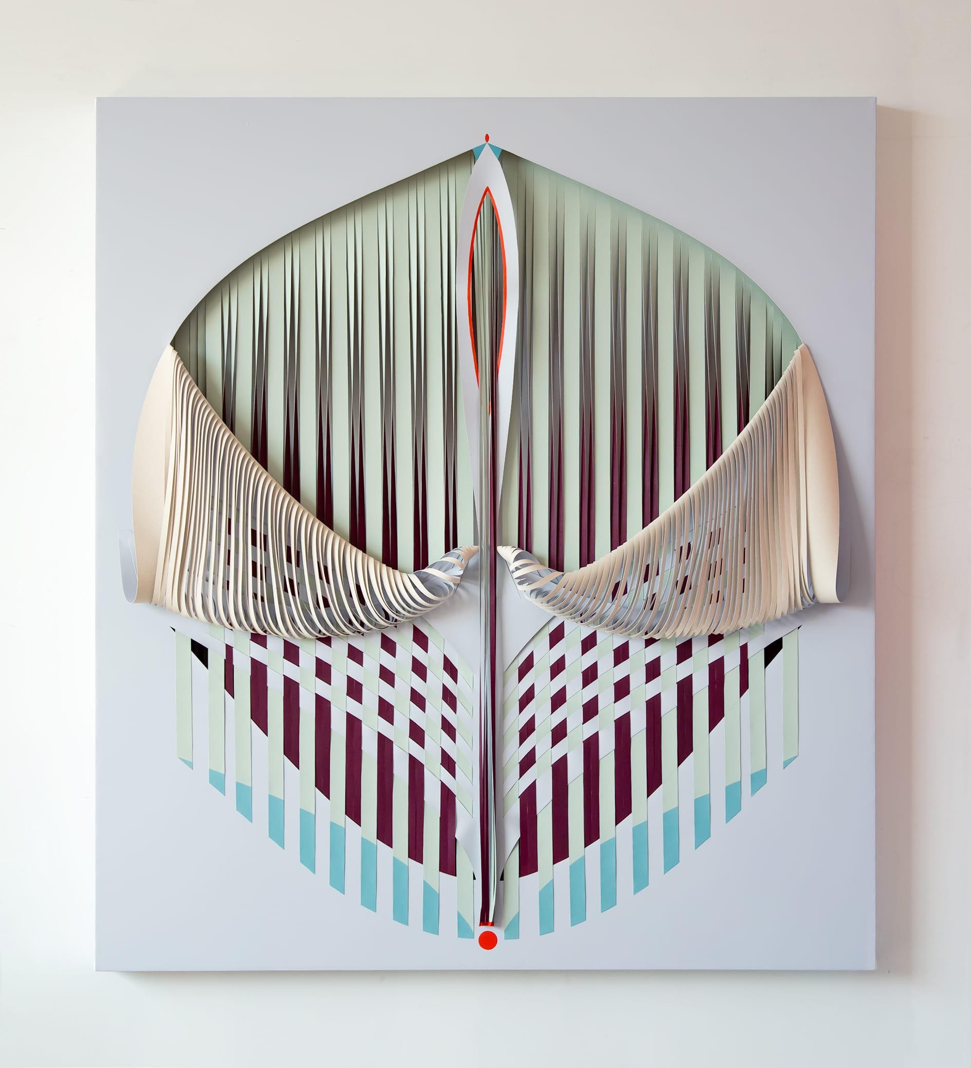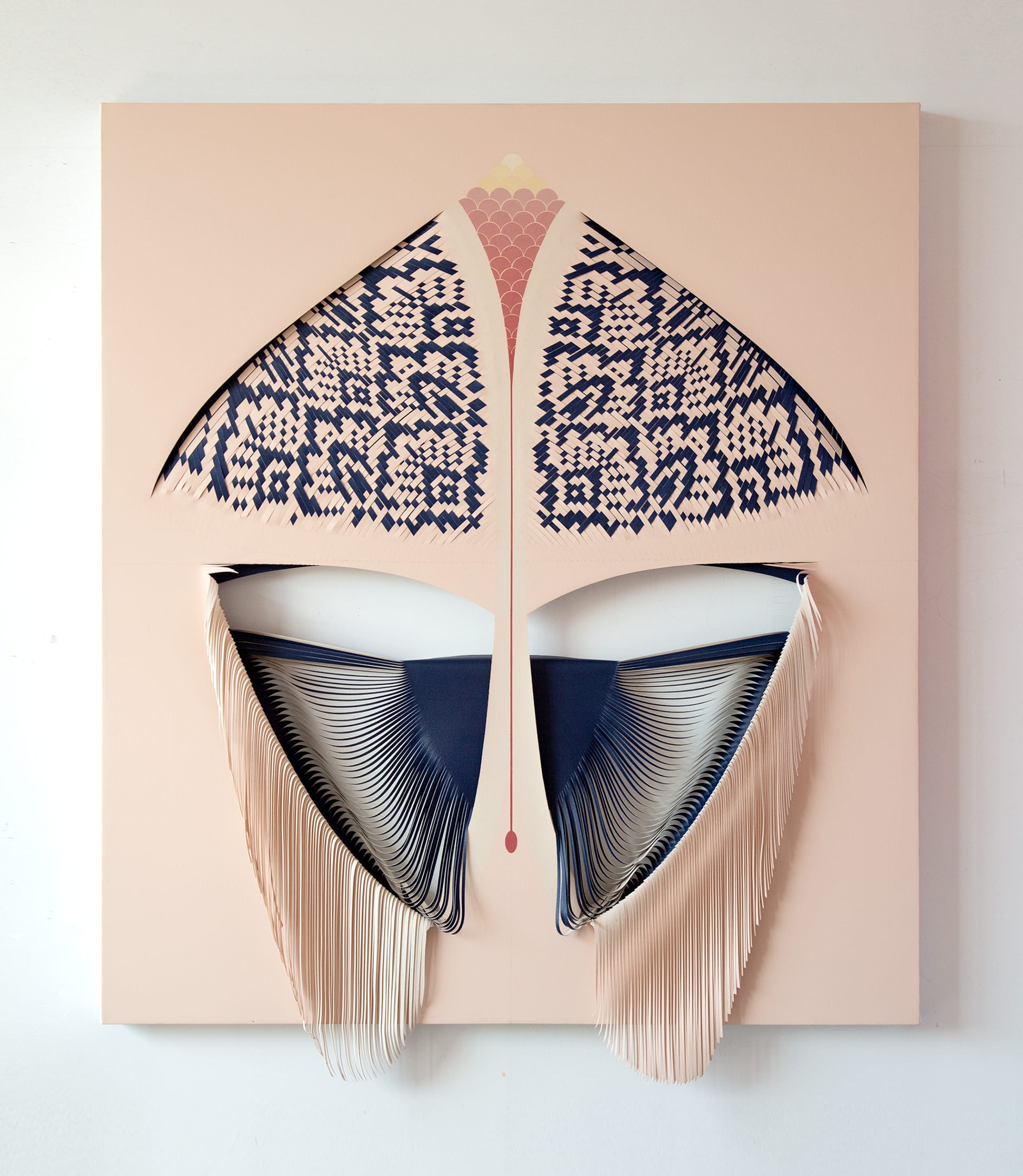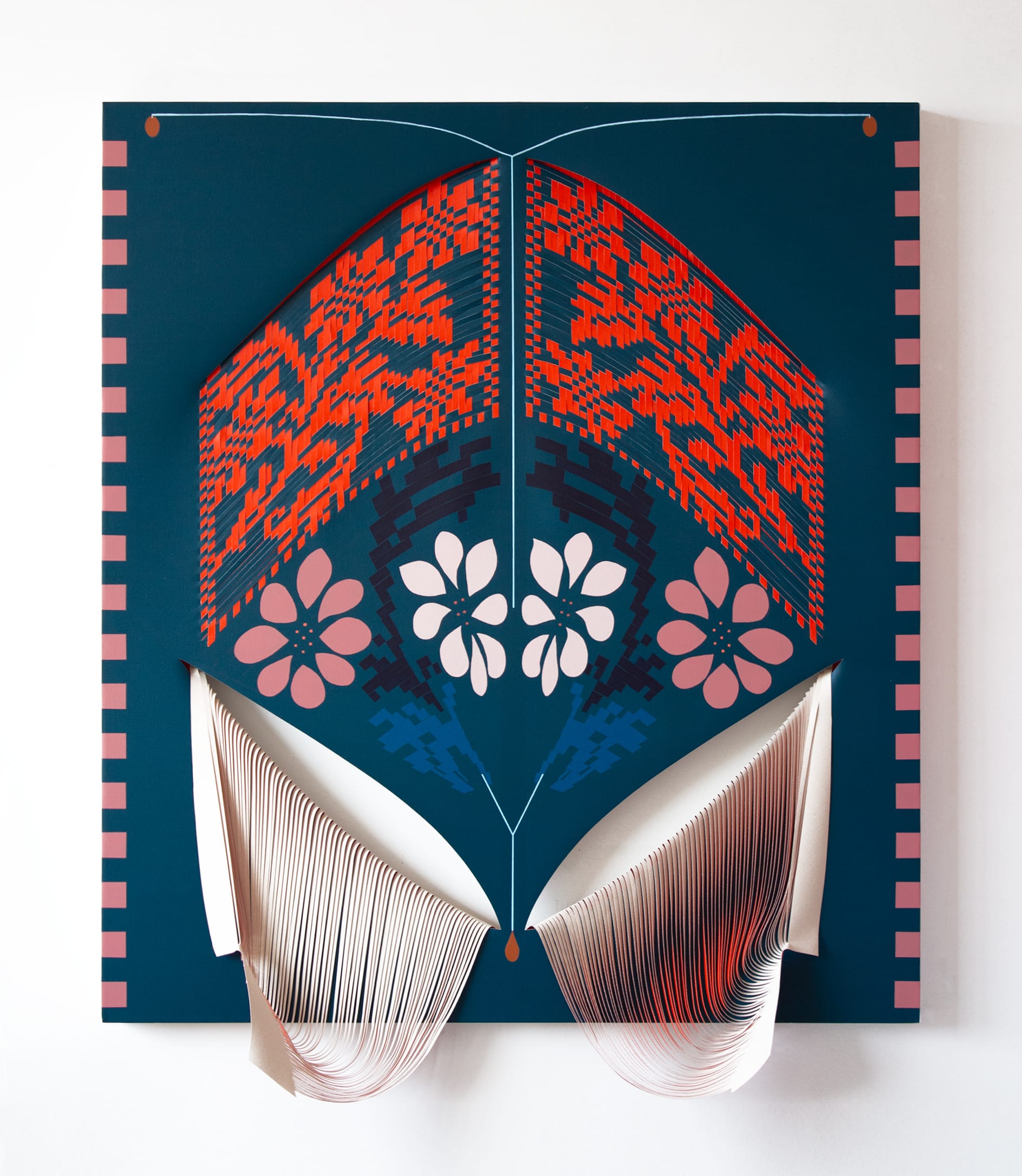 “When the canvas is cut, it opens endless possibilities,” says Colombian painter Cristina Camacho, who weaves intricate patterns into stacked canvases. Her current solo show, /ˈvʌlvə/, at Praxis Gallery — her third since graduating from Columbia’s MFA program in 2015 — evidences an increasingly audacious and masterful play with light, shadow, color, and gravity. Compared to her previous series, which rely more on abstract patterns and geometric forms, /ˈvʌlvə/ blooms with a sense of narrative and symbolism. The canvas seems to have a life of its own, rife with the desire to speak something formerly absent.