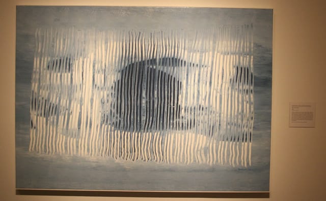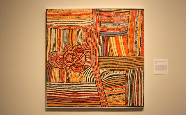 In his essay “Modernist Painting,” Greenberg wrote, “The illusion created by a Modernist is one into which one can look, can travel through, only with the eye.” In other words, the brain, constantly trawling for visual signposts, has nothing to grab onto and perceive as information in non-objective abstraction; we are simply confronted with riots of color, line, and shape. The same is not true for the Aboriginal version of abstraction on display at the Hood museum.