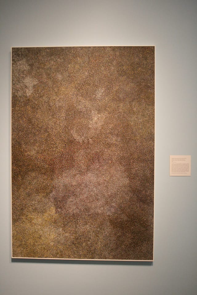 Angelina Pwerle’s painting “Ahakeye Altyerre (Bush Plum Dreaming)” (2000) at first looks like a Yayoi Kusama haze of dots. The shifting web of dark spots is hypnotic in its abstraction, but just how abstract is it? The greens, blacks, and purples of the canvas derive from the ripening process of the native mulga fruit, curator Stephen Gilchrist’s wall label informs us, and Pwerle’s white dots represent women scattering the seeds of the fruit, a ritualistic celebration of fertility.