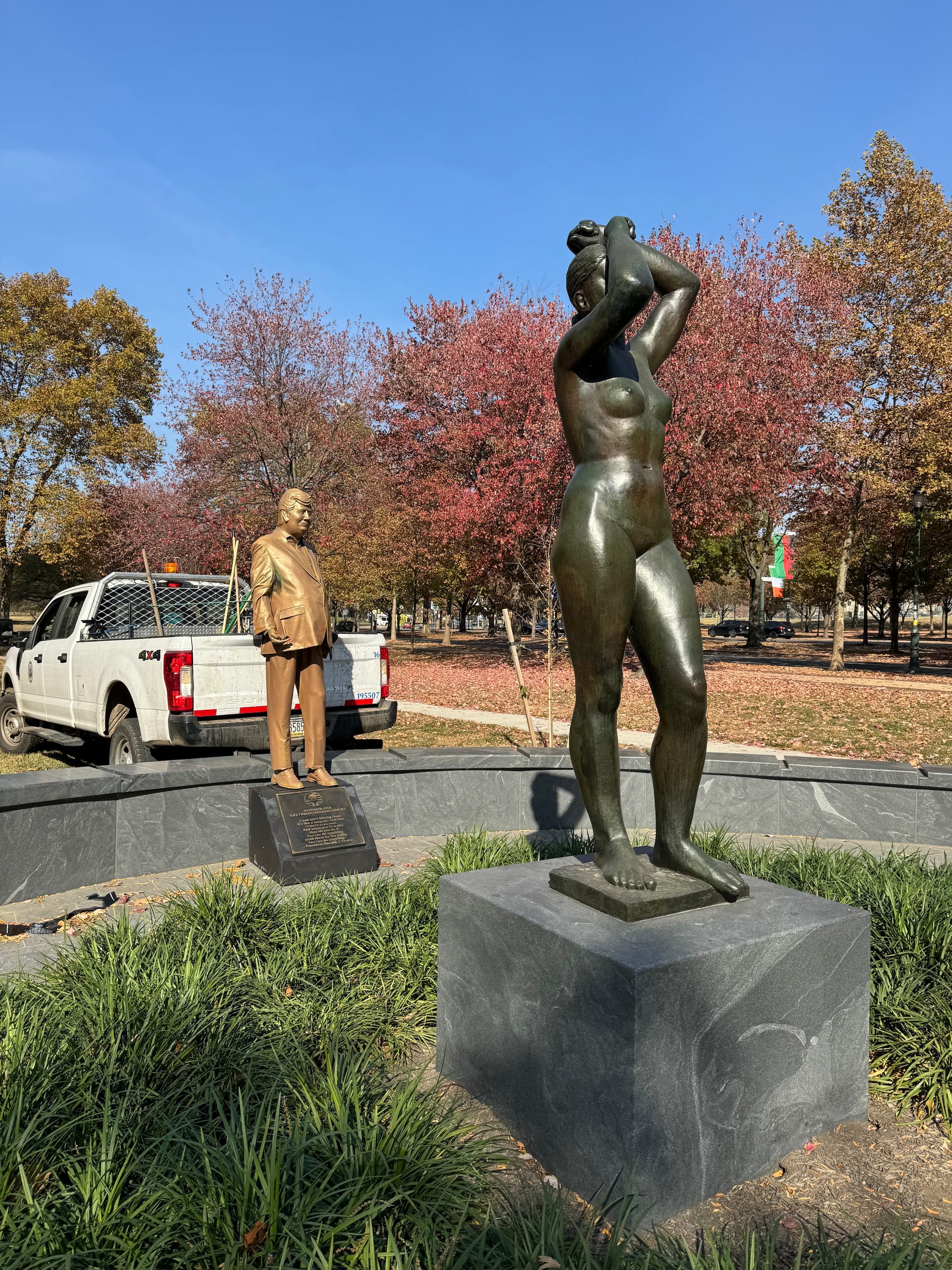 Charlotte Cohen, executive director of the city’s Association for Public Art, told Hyperallergic that she was unaware of a crudely gesturing golden statue of Donald Trump installed behind artist Gerhard Marcks’s bronze “Maja” (1942) in Maja Park until a reporter from the Washington Post called her for comment on Wednesday, October 30.