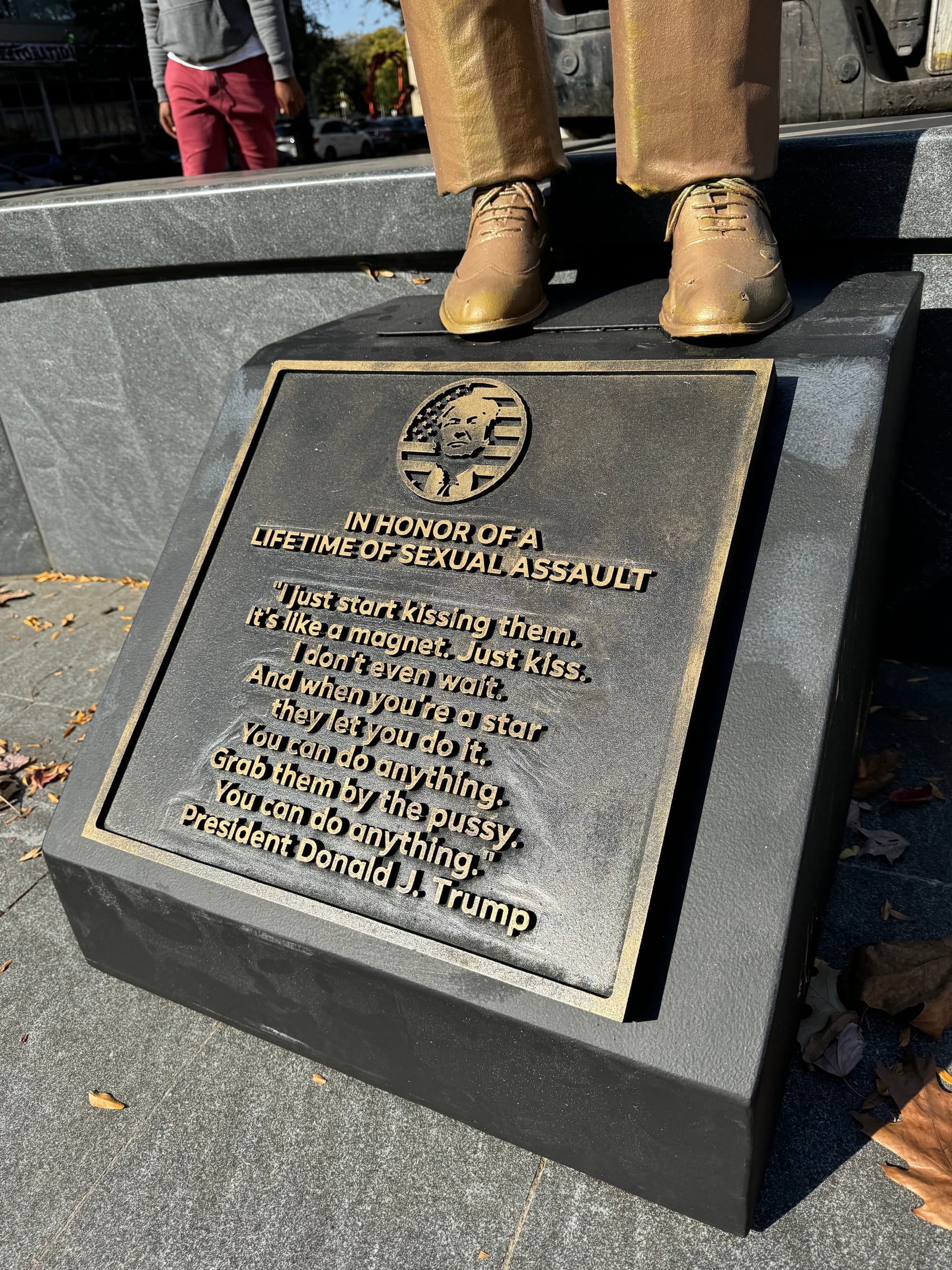 An unknown artist had surreptitiously erected the Trump effigy with a cupped hand pointed toward the nude female figure and a plaque that read, “In honor of a lifetime of sexual assault.” The plinth description features an excerpted transcription of Trump’s infamous “grab them by the pussy” remarks from a recording made in 2005 and leaked ahead of the 2016 presidential election. A duplicate of the statue appearing in Philadelphia cropped up days earlier in Portland facing Norman Taylor’s abstract nude “Kvinneakt” (1975). Hours after it appeared, the Oregonian reported, the sculpture was mysteriously beheaded.