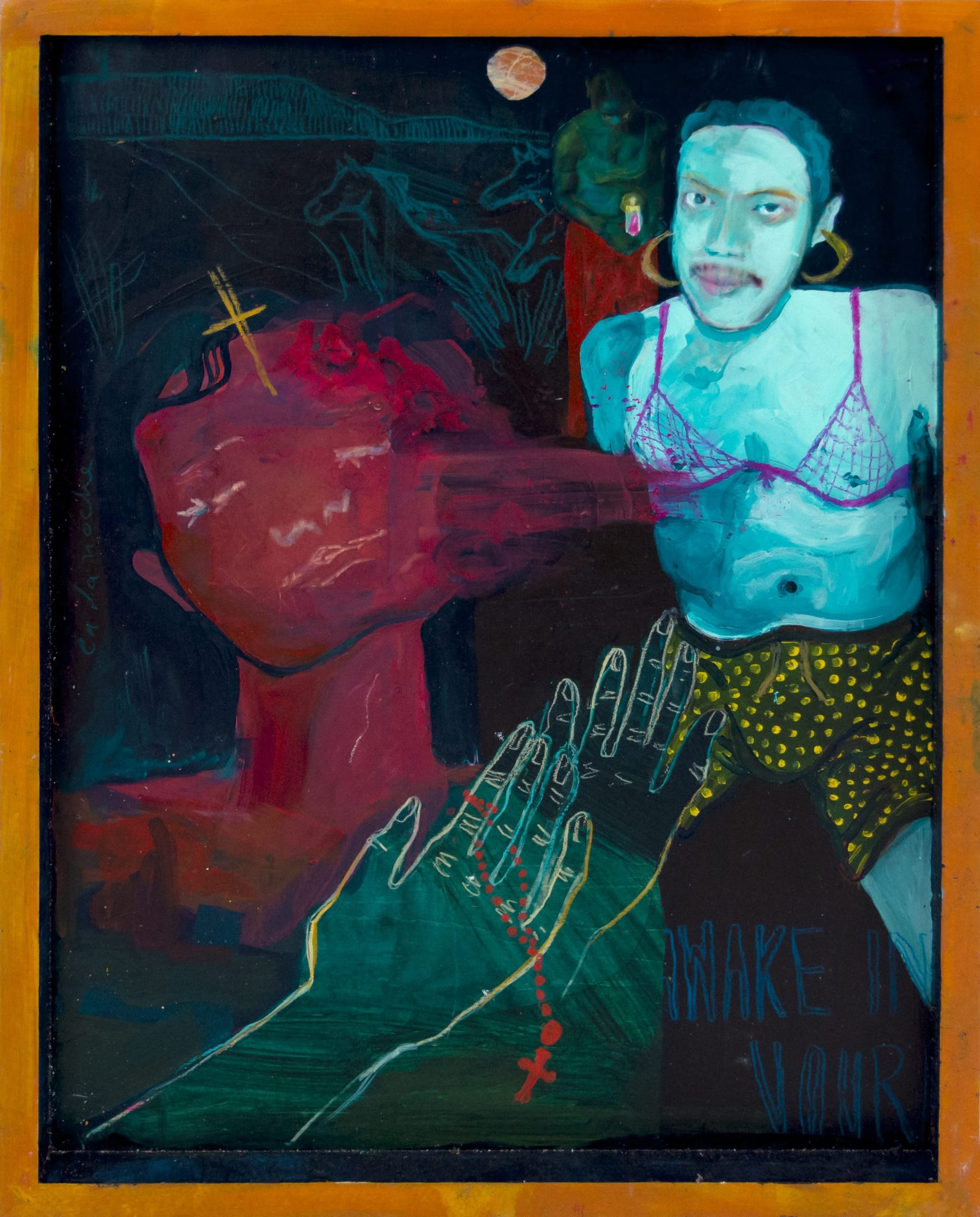 The intergenational exhibition features fourteen artists imagining new, queer(er) timelines and potentials through a range of media, including sculpture, painting, and video. The virtual exhibition is laid out as a bird’s eye view of a gallery installation (map included) — a fitting act of imagination itself. Works like Xandra Ibarra’s “Ya Estuvo” and Marco Da Silva’s “Neither here, nor there A-E” invoke Muñoz’s futurities with their very titles. The digital (re)presentation of large-scale sculptures (such as Beatriz Cortez and rafa esparza’s sprawling “Nomad 13” (2017)) and material textures (like Moises Salazar’s portraits made of glitter, satin, canvas, and yarn) remains a kind of translation but, in this virtual space, ray ferreira’s oceanic glitch GIFs “freshwetdrencht” and “postfleshscreensurface” (both 2021) become portals from and reminders of the glowing webpage mediation.
