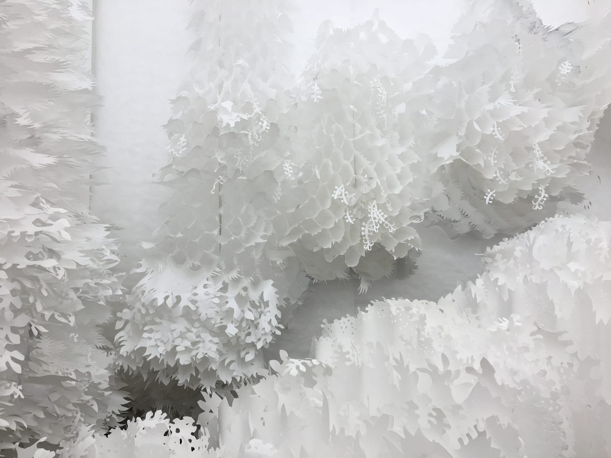 Upon entering the Halsey’s galleries, one steps into the enveloping tangles of an oversized black garden, employing Ma’s signature honeycomb paper structures and cultivated chaos. Crawling vines and giant leaves and fruits are complimented by motion-sensored elements that retreat when approached by the visitor. Ink-on-glass landscape paintings further the illusory landscape created by the gardens and places the viewer’s reflection within this constructed paradise. One must then push through a flower portal reminiscent of a botanical birth canal, emerging from darkness into the garden of light. Dark impenetrability gives way to shocking brightness, and comforting ambiguity is replaced with glaring clarity. Mirroring the responsive intelligence of the dark garden, portions of this cut-paper foliage move to greet visitors in extraverted display.