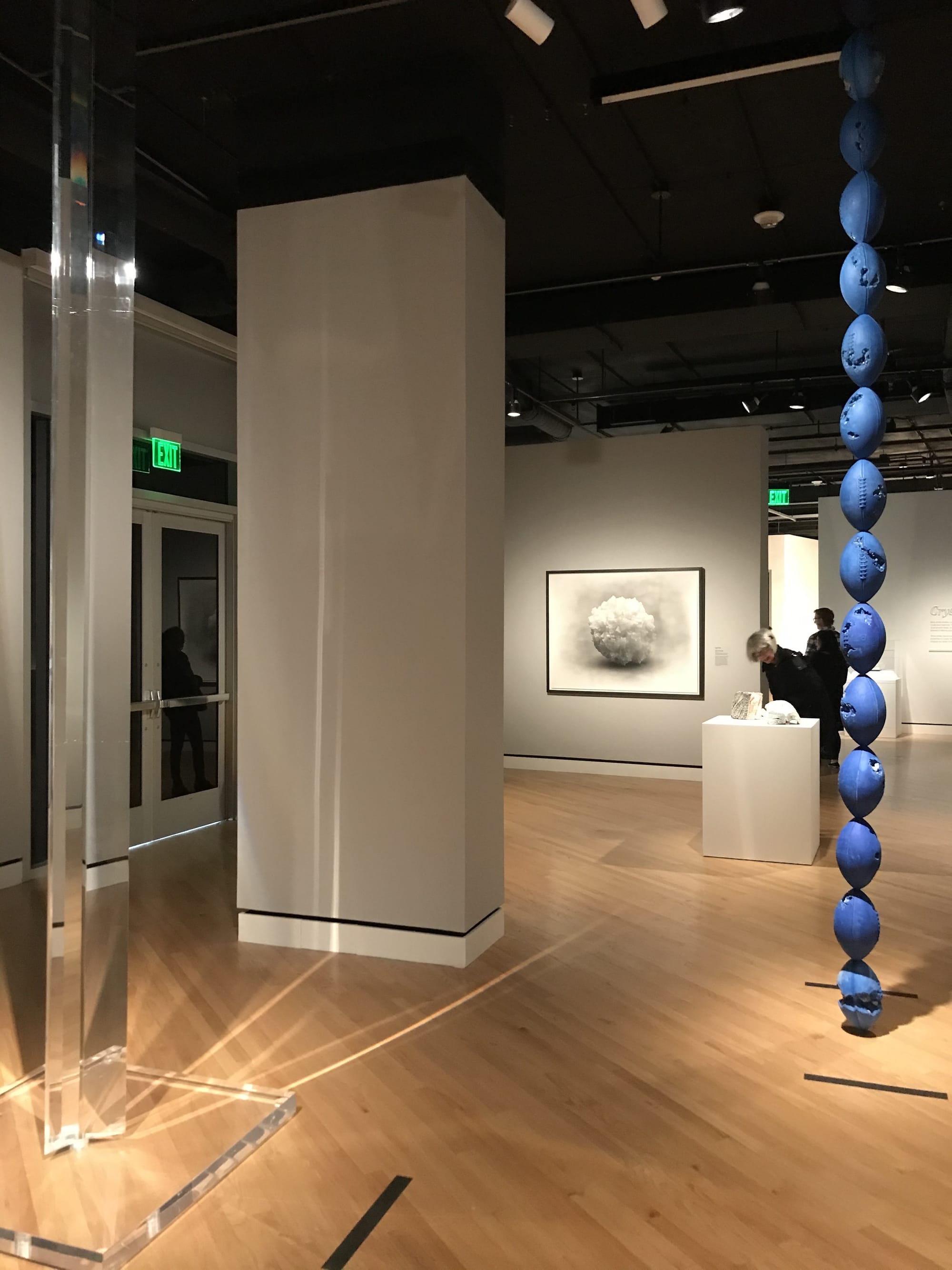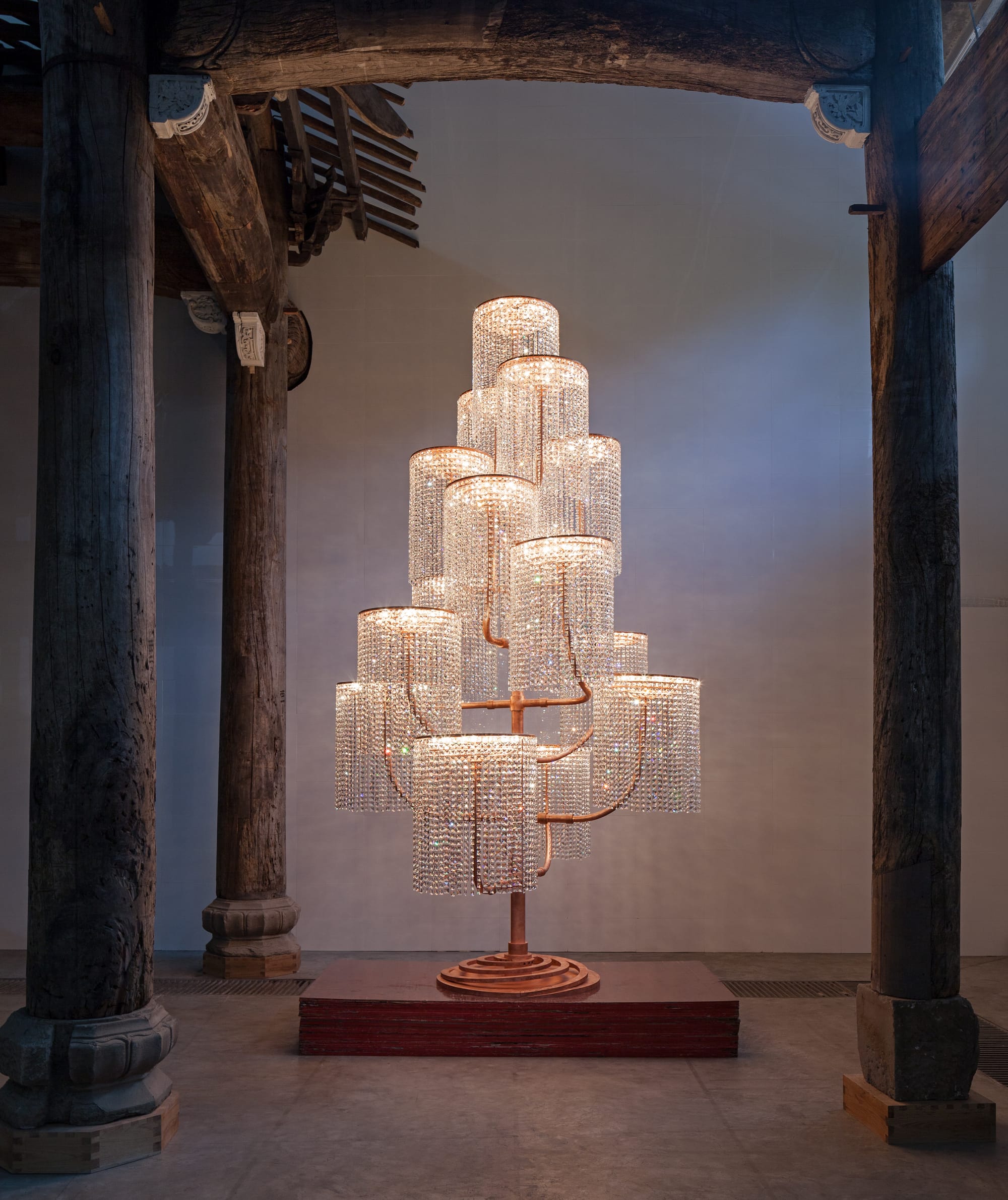 But this light installation is only the penultimate marvel. The reverie breaks with Ai Weiwei’s enormous (fake) crystal light tree, “Chandelier” (2015). Viewers might ignore altogether Miya Ando’s quiet “Tides” (2011), aluminum plates dusted with sapphire crystals, for the Instagrammable moment “Chandelier” provides. Weaving through the crowd to avoid featuring in someone’s snap or Boomerang, I felt jilted ending here, looking at these slightly dirty, brilliantly lit glass squares. It’s as if the crystalline infinite evoked by “Portal Icosahedron” and previous objects is not art’s ability to vacillate between chaos and order or to explore some yet-unearthed psychological insight — but merely our limitless greed for shiny objects.