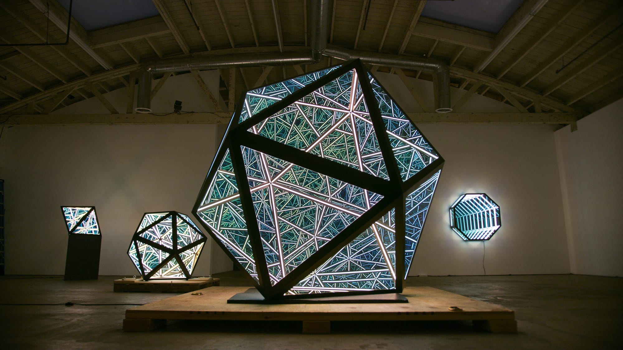 It was hard to give Arnold’s borax-encrusted books their due with the pièce de résistance glowing near the exit. Anthony James’s “Portal Icosahedrons” (2019) are two 20-sided steel structures, one average waist-height, the other taller than most heads, both lined with light bars at each edge and mirrors on each face. When not crossing and joining in points that reach a seemingly infinite distance, the light bars fall into a perfect hexagon, framing a black void. Rather than some cosmic expanse, it seems like a portal to something internal, suggesting a depth of self and psyche perhaps too remote to plumb.