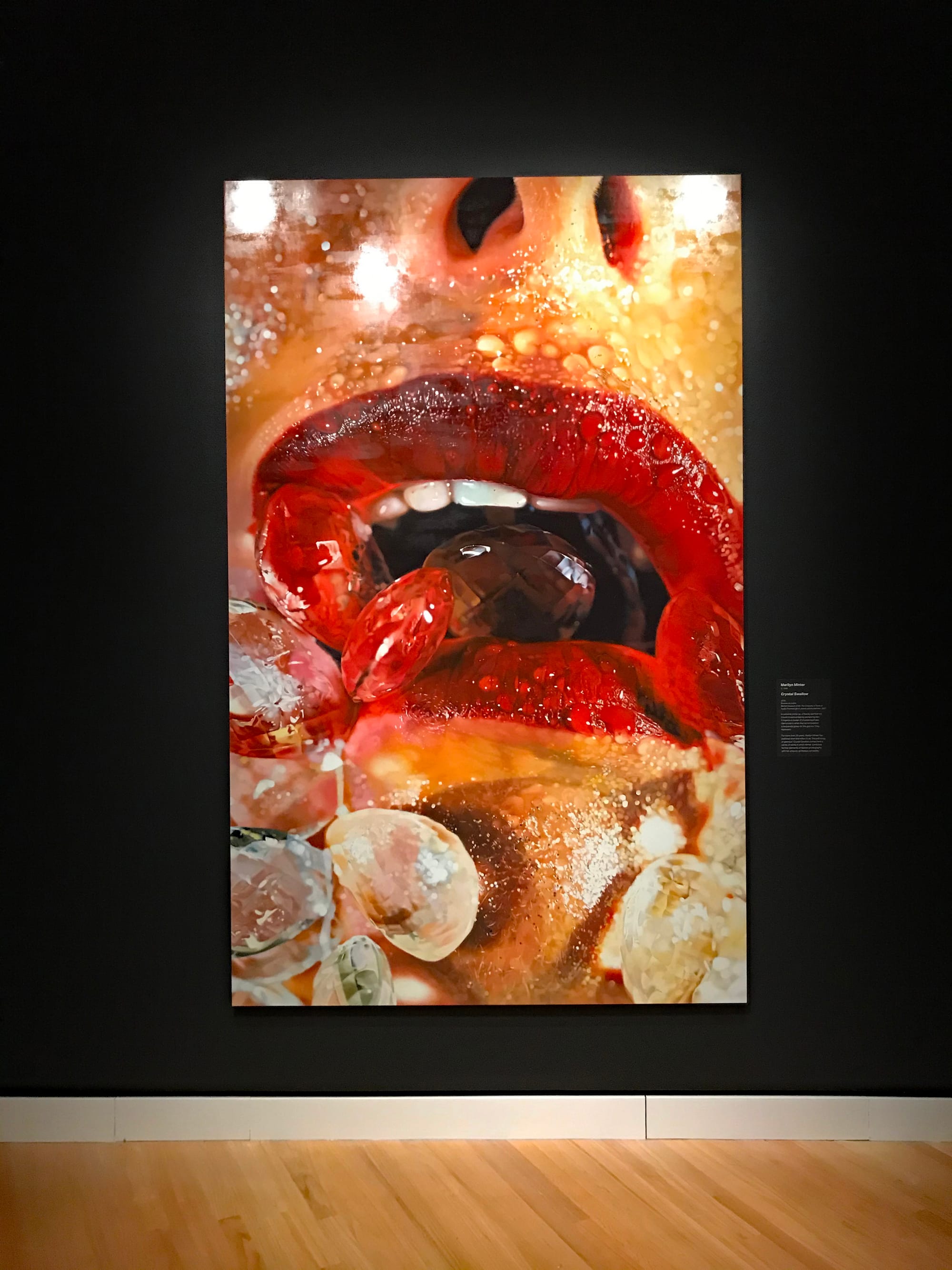 The union of crystal and body continues in a video installation by Abramović. In “Dozing Consciousness” (1997), a close crop of the artist’s face shows it buried in thin quartz rods that shift gently over her eyes, nose, and mouth when she breathes. Light, tinkling edges give way to carnal curves when you turn to see Marilyn Minter’s “Crystal Swallow” (2006) beckoning from the next room. In Minter’s enamel painting, wet rouge lips part to hold a crystal like a lozenge. This wing is dedicated to human decadence; crystal beckons like candy for consumption or serves to adorn people and homes.