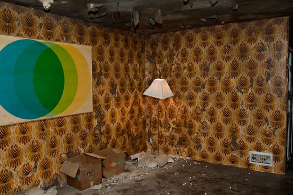 In fact, the artists took their fiction a step even farther by staging a happening earlier this summer in the Buck house. Black-and-white photographic “documentation” of the revelers is exhibited in one room, framed and spotless. And this is unfortunately where the spell breaks. The photos remind you: all this is for sale. Comely, self-conscious Angelenos dressed in various costumes pose and preen before the camera offering cocked eyebrows or their best chin angle. This isn’t how a bunch of drugged out people seeking mystical enlightenment might have posed 40 years ago. This is portraiture in the age of Facebook and online dating. This is the overly-mediated 21st century longing for a realer bohemianism than what comes in a packet of organic green tea from Whole Foods. It’s all just surface, and a joke, like the spray-on mold on the wallpaper.