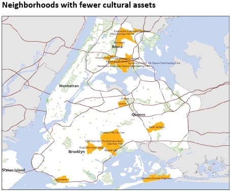 There are some expected findings of the study, like that aspects of wellbeing such as security, health, education, and housing are strongly correlated to economic wellbeing, race, and ethnicity. Following on this, SIAP found that 35% of New York City neighborhoods are characterized by “concentrated disadvantage,” while another 38 % are considered “diverse and struggling.” This is part of the understanding of the study’s central finding: “the cultural resources in the city are overwhelmingly concentrated in relatively few neighborhoods,” which they rightly determine is an impediment to social justice. The neighborhoods that are identified as deserving more attention due to their relative lack of cultural resources include East New York, Gravesend, and South Jamaica in Brooklyn, Corona Park in Queens, and Soundview, Eastchester, and Williamsbridge in the Bronx.